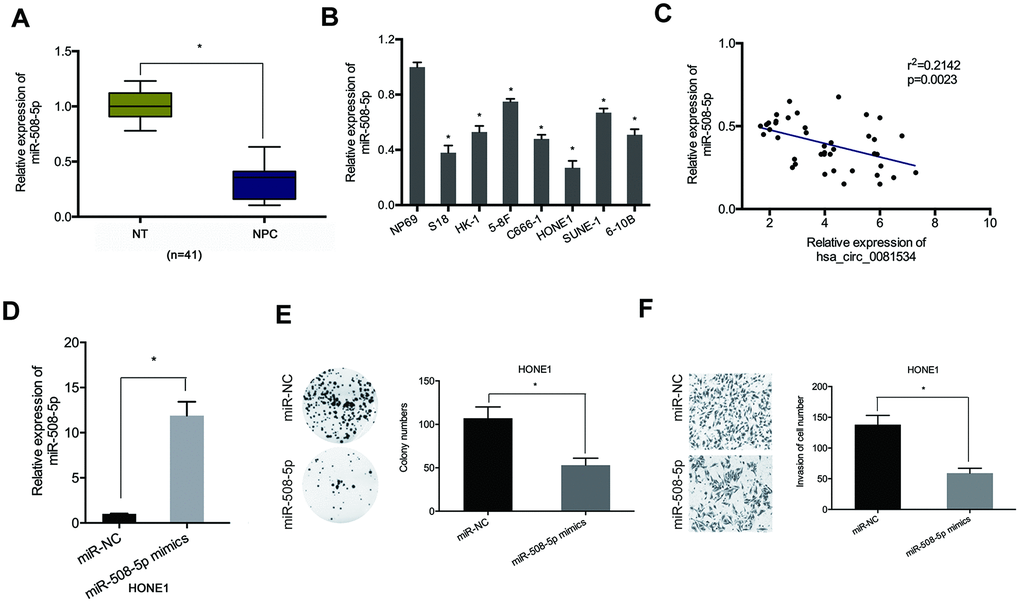 We also detected miR-508-5p expression in NPC tissues and cells by using qRT-PCR. As shown in in Figure 4A, 4B, miR-508-5p expression in NPC tissues and cell lines was significantly reduced compared to adjacent normal tissues and cells. Correlation analysis showed that miR-508-5p expression associated inversely with hsa_circ_0081534 expression in NPC tissues (Figure 4C). Thereafter we examined the roles of miR-508-5p in NPC cells. Functional assays indicated that miR-508-5p overexpression significantly reduced proliferative and invasive abilities in NPC cells (Figure 4D–4F). Ultimately, these data suggested that hsa_circ_0081534 might function as a miR-508-5p sponge in NPC cells progression.