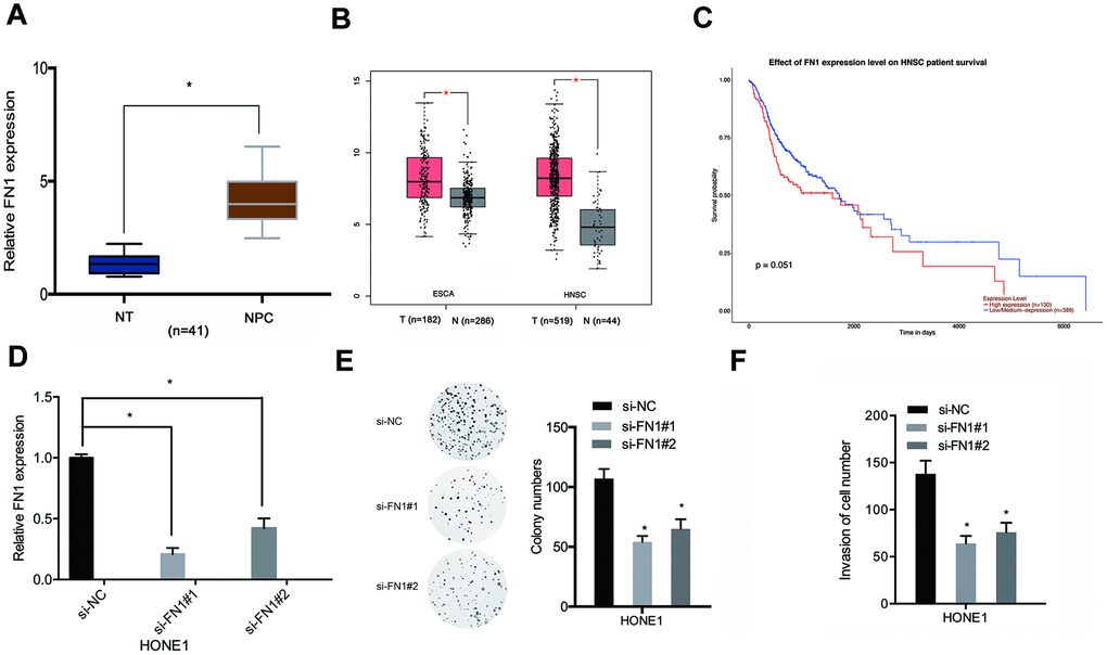 We next sought to assess FN1 expression in NPC samples. QRT-PCR results indicated that FN1 expression was relatively highly expressed in NPC tissues compared with adjacent normal tissues (Figure 6A). In addition, these findings were supported by the results from a search of the TCGA database (Figure 6B). Kaplan-Meier analyses indicated that elevated FN1 expression was significantly correlated with poorer prognosis for NPC patients (Figure 6C). Then, we examined the roles of FN1 in NPC cells. QRT-PCR indicated that FN1 was significantly downregulated in HONE1 cells (Figure 6D). Functional assays indicated that FN1 inhibition significantly reduced proliferative and invasive abilities of HONE1 cells (Figure 6E, 6F). These data supported that FN1 was a downstream gene of miR-508-5p in NPC cells.