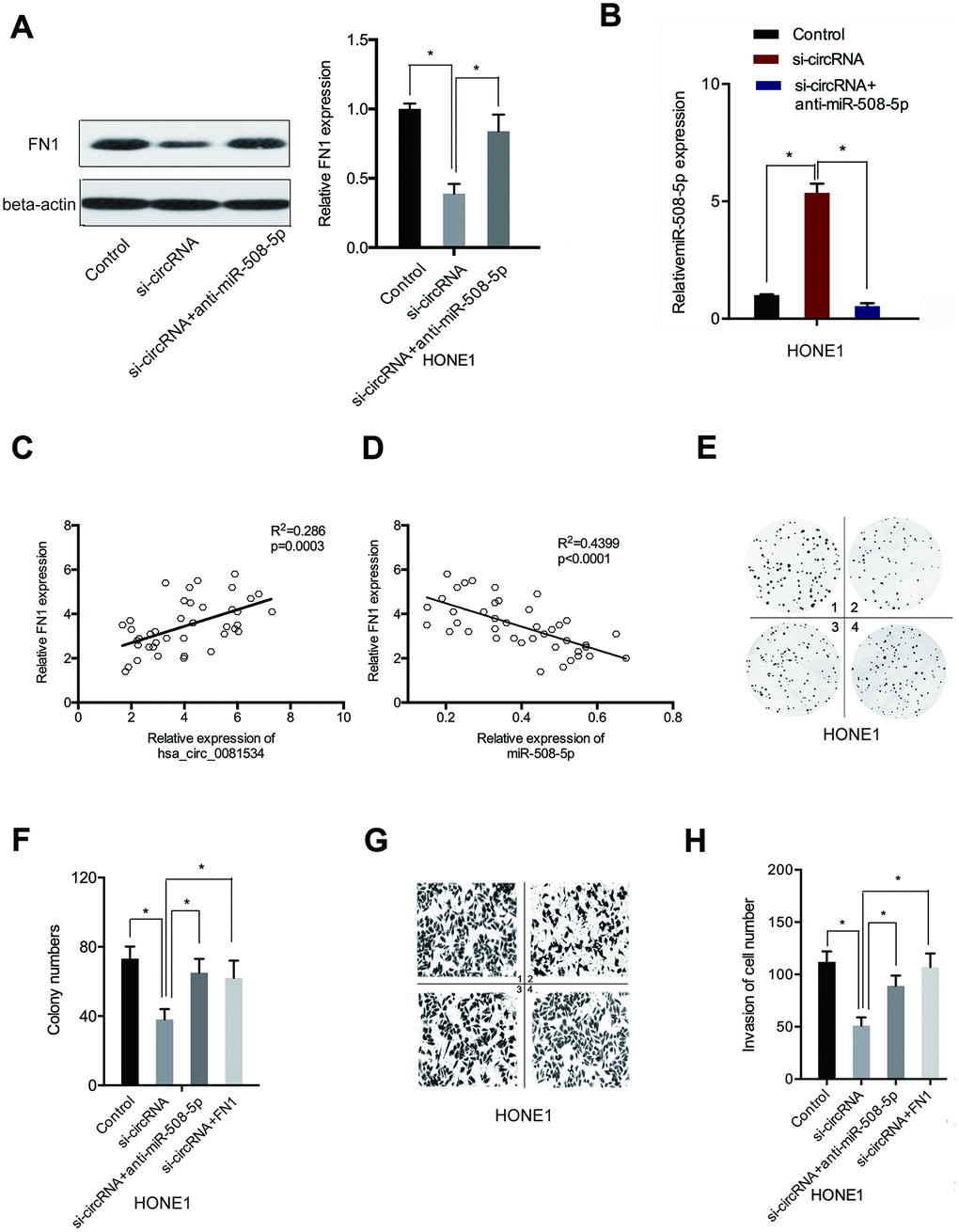 Next, we explored if hsa_circ_0081534 influenced the progression of NPC through regulation of the miR-508-5p/FN1 axis. Findings from western blot indicated that silencing hsa_circ_0081534 subsequently decreased FN1 expression in NPC cells, and the effects could be reversed through inducing miR-508-5p inhibition (Figure 7A), and the expression of miR-508-5p was also explored (Figure 7B). Next, we assessed relationships among hsa_circ_0081534, miR-508-5p, and FN1. Association analyses indicated that hsa_circ_0081534 expression was positively correlated with FN1 expression in NPC tissues (Figure 7C). In addition, FN1 expression correlated inversely with miR-508-5p expression in NPC tissues (Figure 7D). Moreover, rescue assays suggested that FN1 overexpression (or miR-508-5p inhibition) subsequently reversed the results of hsa_circ_0081534 silencing on HONE1 cell proliferative (Figure 7E, 7F) and invasive abilities in vitro (Figure 7G, 7H).