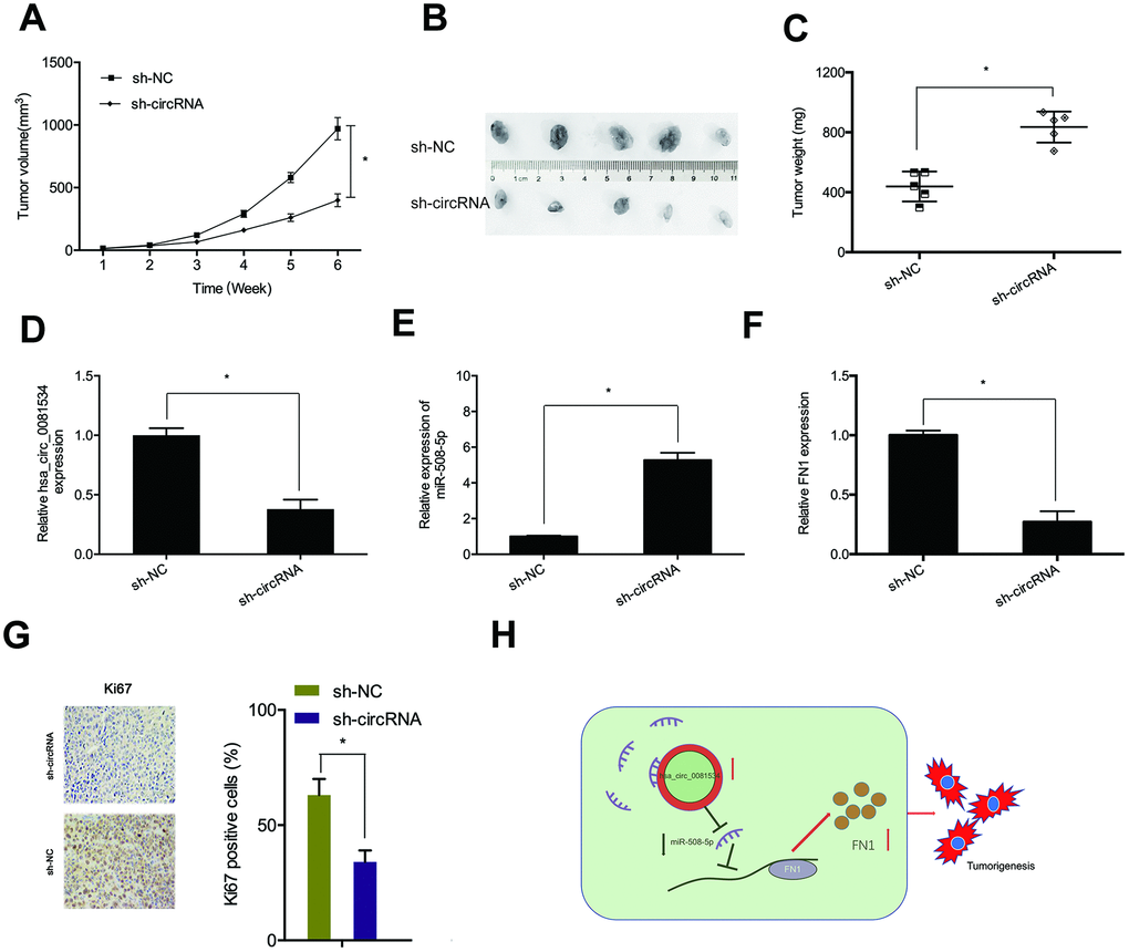 To assess roles of hsa_circ_0081534 in vivo, we established a murine xenograft using S18 cells expressing sh-circ_0081534 or sh-NC. As shown in Figures 8A, hsa_circ_0081534 depletion subsequently inhibited NPC tumor growth in vivo. Furthermore, both dimensions and weights of tumors were smaller in the sh-circ_0081534 group compared with sh-NC group (Figure 8B, 8C). Abundances of hsa-circ_0081534, miR-508-5p, and FN1 were determined for NPC tissues dissected from mice. As shown in Figure 8D–8F, significantly decreased levels of expression of both hsa-circ_0081534 and FN1 were found in the sh-circ_0081534 group, whereas hsa-circ_0081534 depletion subsequently and notably increased miR-508-5p expression in NPC tumor afflicted tissues. In addition, Ki67 staining assay revealed that hsa_circ_0081534 knockdown subsequently suppressed tumor cell proliferation in vivo (Figure 8G). These outcomes indicated that hsa_circ_0081534 promoted NPC progression by sponging miR-508-5p to increase FN1 expression (Figure 8H).