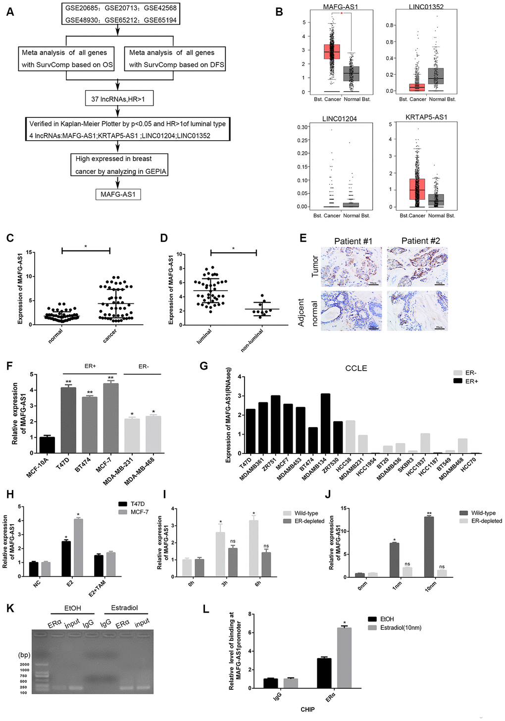 To determine whether the MAFG-AS1 promoter contained an ERα binding region, we predicted the binding map of the promoter region of MAFG-AS1 and ERα in Jaspar (http://jaspar.genereg.net/). As expected, a binding site with the sequence AAAGGTGGCTCTGGCCAC (Supplementary Figure 1H) was identified. In addition, the binding site could also be found in PROMO (http://alggen.lsi.upc.es/cgi-bin/promo_v3/promo/promoinit.cgi?dirDB=TF_8.3) (Supplementary Figure 1I). ESR1 chromatin immunoprecipitation-sequencing (ChIP-seq) in T47D identified ERα binding to the MAFG-AS1 promoter (Supplementary Figure 1J). Furthermore, chromatin immunoprecipitation (ChIP) assay identified ERα binding to the MAFG-AS1 promoter following estrogen stimulation in T47D (IgG as negative control) (Figure 1K, 1L). Taken together, these results suggested that MAFG-AS1 expression was estrogen-responsive and dependent on ERα in luminal breast cancer cells. MAFG-AS1 might be an important target in the development of ER+ breast cancer.