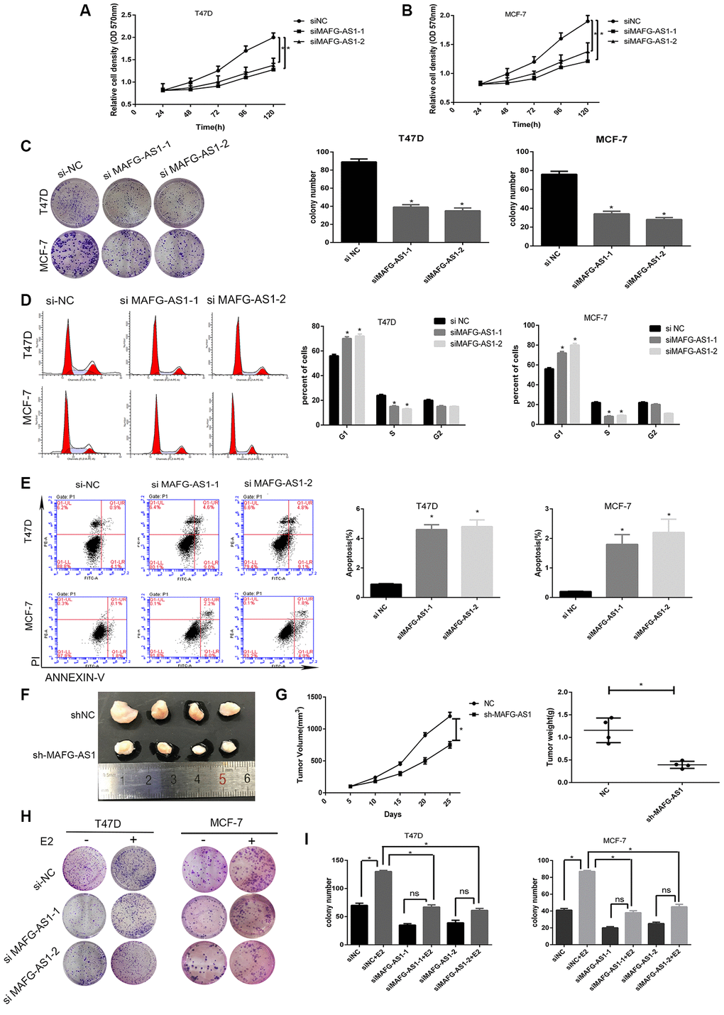 To reveal the role of MAFG-AS1 in breast cancer progression, we used MCF-7 and T47D ER+ breast cancer cell lines for in vitro experiments. Two MAFG-AS1 specific knockdown sequences (si-MAFG-AS-1 and si-MAFG-AS1-2) were designed and synthesized, and the knockdown efficiency of both cells was detected by qRT-PCR to be > 50% (p < 0.01) (Supplementary Figure 2A, 2B). A significantly reduced proliferation rate was observed in MAFG-AS1-knockdown MCF-7 and T47D cells compared to control cells (Figure 2A, 2B). Moreover, colony formation assays confirmed that the numbers of colonies in the si-MAFG-AS1-1 and si-MAFG-AS1-2 groups were significantly decreased compared to those in the control group (Figure 2C). To further explore whether the observed phenomenon was related to cell cycle, flow cytometry analysis was performed. MAFG-AS1 knockdown arrested the cell cycle at G1 phase in both MCF-7 and T47D cell lines (Figure 2D). Also, the number of apoptotic cells in both cell lines increased after knockdown of MAFG-AS1 (Figure 2E), indicating an anti-apoptotic effect.
