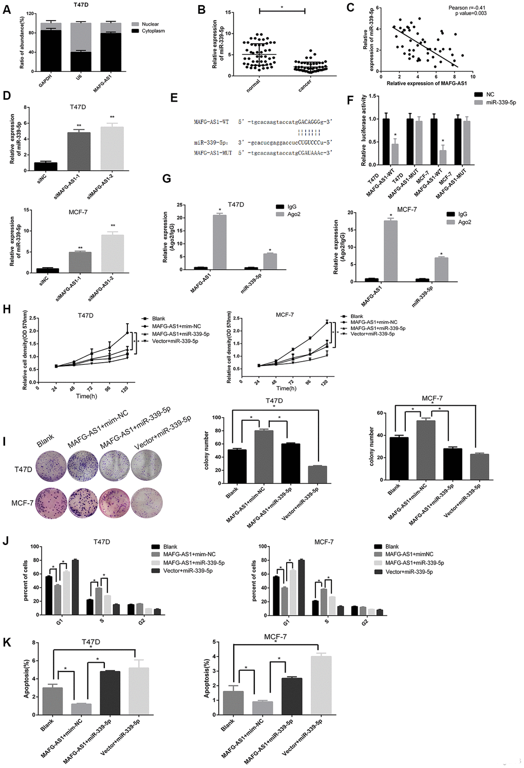 To investigate the functional relationship between MAFG-AS1 and miR-339-5p, we performed MTT and colony formation assays, showing that miR-339-5p could attenuate cell proliferation induced by MAFG-AS1 (Figure 3H, 3I). Overexpression of MAFG-AS1 could promote cell cycle transition from G1 to S phase, whilst the addition of miR-339-5p arrested the cell cycle at G1 phase (Figure 3J, Supplementary Figure 3G). The number of apoptotic cells was also decreased by overexpression of MAFG-AS1, which was attenuated by miR-339-5p (Figure 3K, Supplementary Figure 3H). Overall, MAFG-AS1 acted as a competitive endogenous RNA for miR-339-5p in both structure and function.
