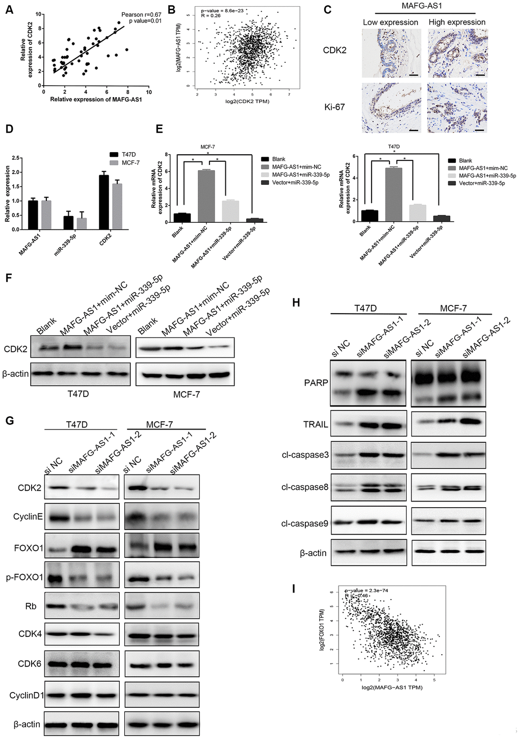 We then explored the mechanism related to cell apoptosis. Previous studies have shown that CDK2 interacts with FOXO1 (forkhead transcription factor 1) and phosphorylates it to p-FOXO1, which is inactive. Importantly, activated CDK2 inhibits the pro-apoptotic function of FOXO1 and regulates the transcriptional expression of pro-apoptotic genes such as FasL, Bim and TRAIL [36, 37]. To verify the role of MAFG-AS1, we found that FOXO1 up-regulated after knockdown MAFG-AS1, while inactive p-FOXO1 was down-regulated. Apoptosis-related genes including TRAIL, cl-caspase3, cl-caspase8, and PARP were up-regulated, but cl-caspase9 showed no significant difference. We also found that MAFG-AS1 regulated the process of exogenous apoptosis through CDK2 phosphorylating FOXO1 which was negatively correlated with MAFG-AS1 at mRNA level in GEPIA (r = -0.46, p < 0.0001) (Figure 5H, 5I). These data suggested that the MAFG-AS1/miR-339-5p/CDK2 axis regulated proliferation in ER+ breast cancer.