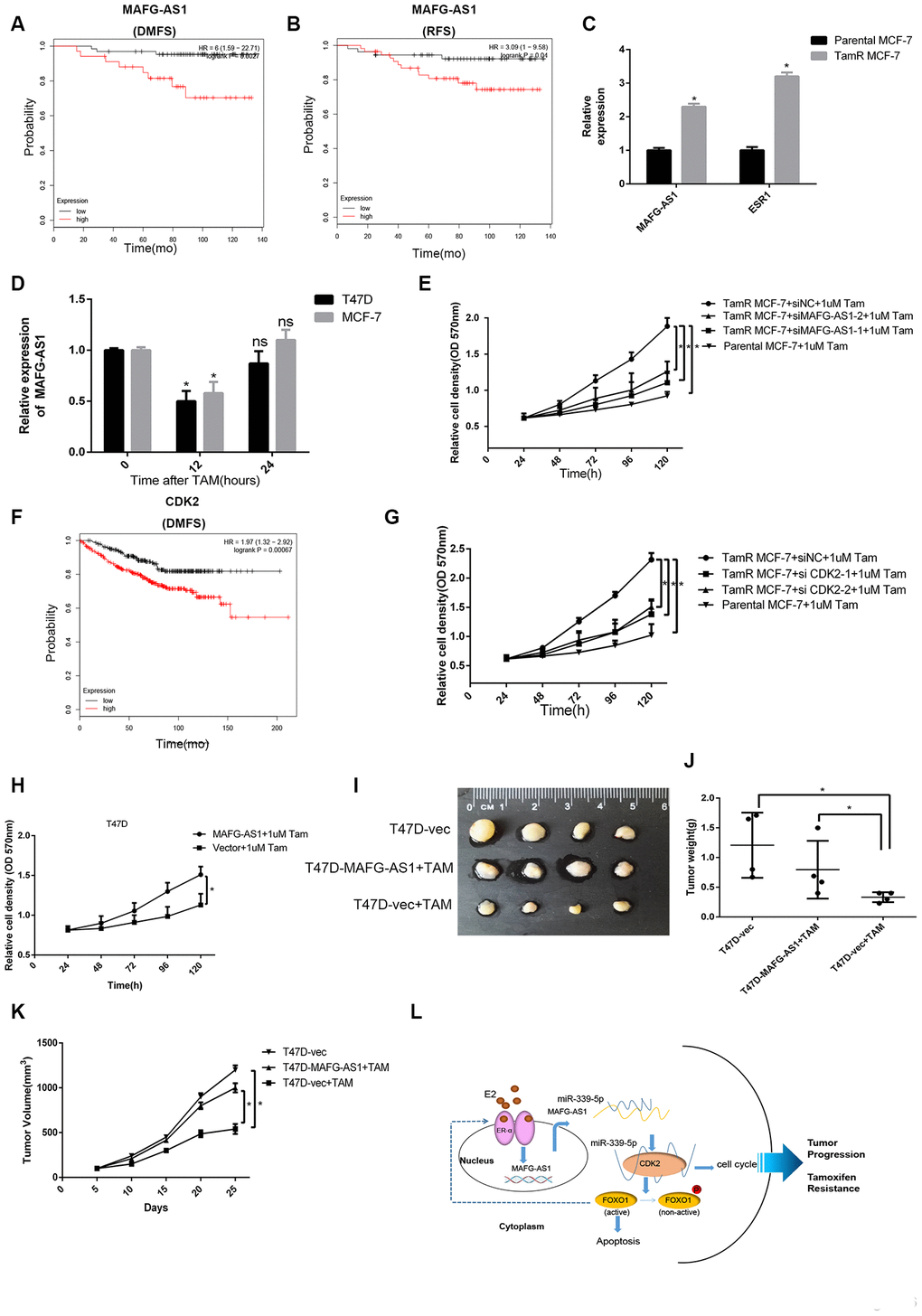 Next, the ability of MAFG-AS1 to increase tamoxifen resistance in native T47D cells was investigated by MAFG-AS1 overexpression. As expected, MAFG-AS1 overexpression exhibited proliferative advantage more than negative control vectors (Figure 6H). More importantly, we constructed T47D-vector and T47D-MAFG-AS1 lentiviral stable transfected cell lines which were injected into the fat pads of nude mice for in situ tumor formation. When the tumor reached a volume of about 100 mm3, mice were given tamoxifen treatment. Compared to the group of T47D-vector cells without tamoxifen treatment, the tumor volume and weight of the T47D-MAFG-AS1+TAM group were similar but significantly greater than the T47D-vector+TAM group (Figure 6I–6K). These data indicated that MAFG-AS1 and CDK2 promoted tamoxifen resistance in an estrogen-independent manner in ER+ breast cancer.