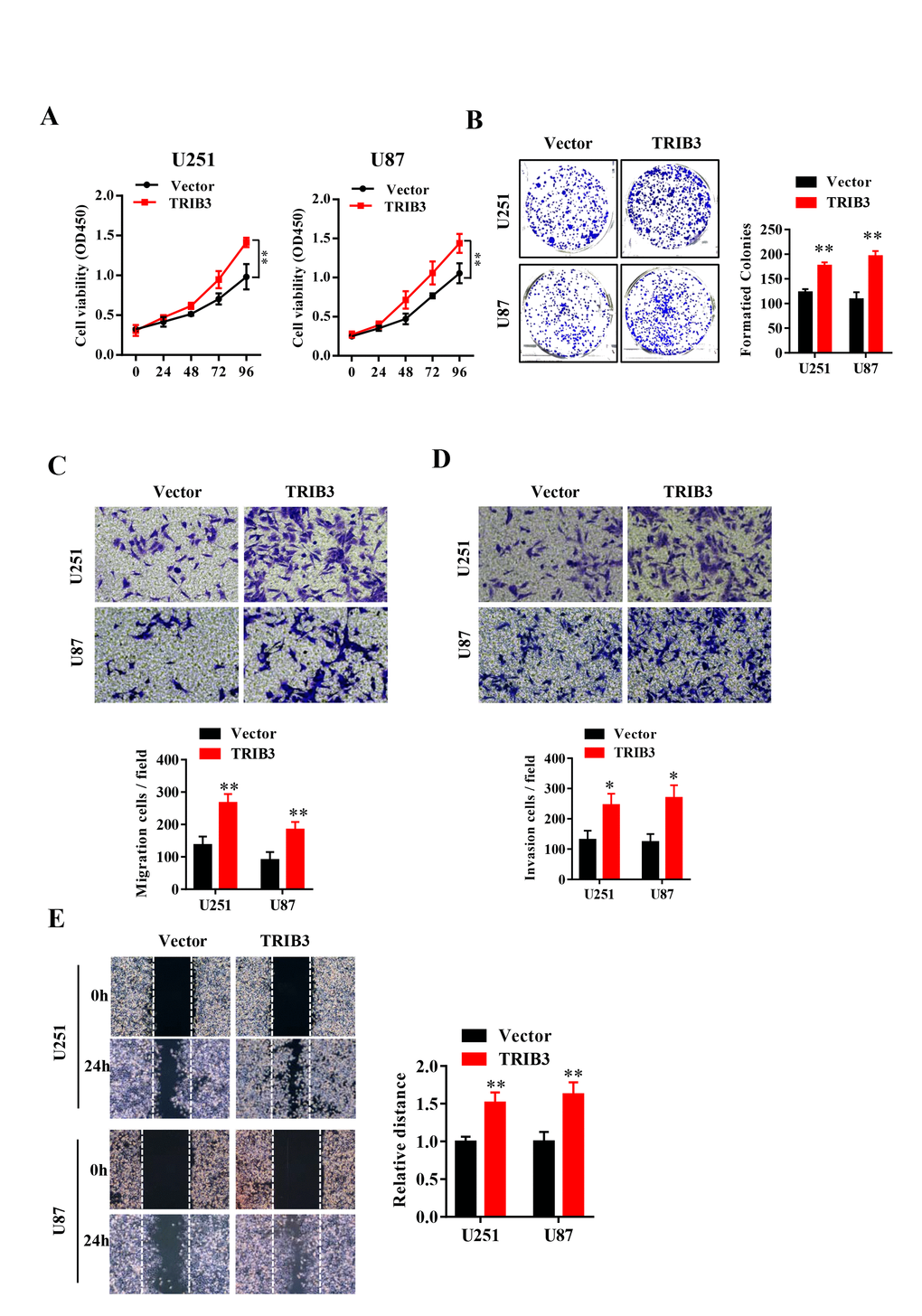 To explore the function of TRIB3 in glioma, we transfected glioma cell lines with lentivirus carrying TRIB3 or vector, and the overexpression efficiency was verified by Western blot (data not shown). We assessed the cell viability after transfection at different times and found that GBM cells transfected with TRIB3 showed had higher cell viability than the vector control cells (Figure 2A). Next, we performed colony formation assays of GBM cells transfected with vector and TRIB3 and found that TRIB3 increased the colony formation of GBM cells. The cell migration and invasive ability of GBM cells were measured by Transwell assay and wound healing assay, and we found that upregulation of TRIB3 increased cell proliferation, migration, and invasion of GBM cells (Figure 2B–2E).