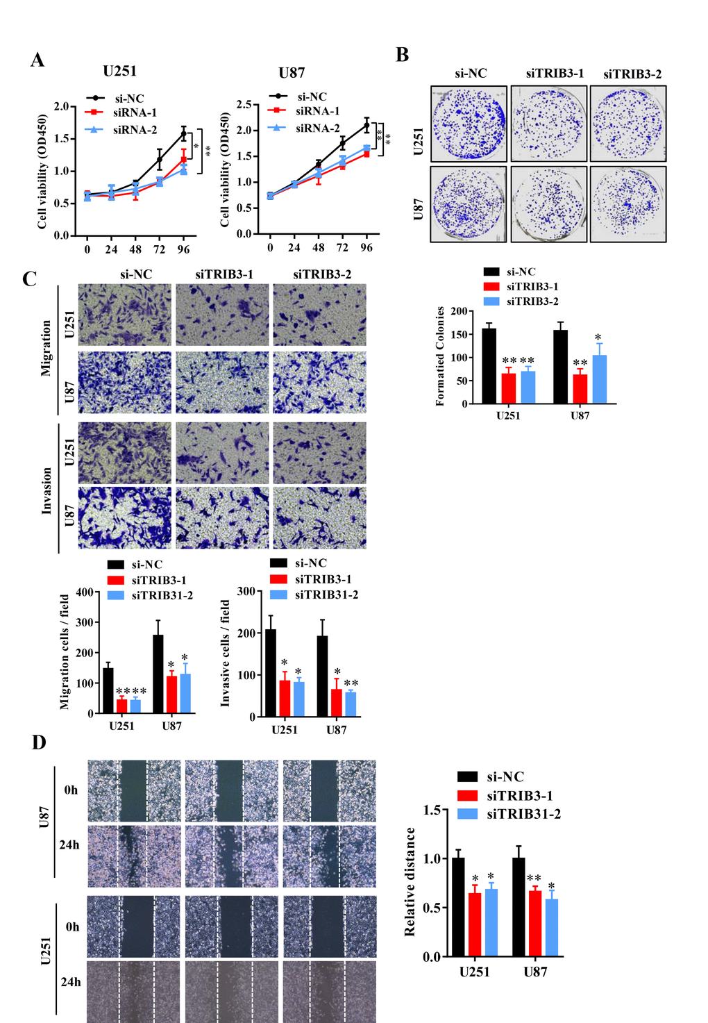 To further explore the function of TRIB3 in glioma, we transfected glioma cell lines with a plasmid carrying shRNA targeting TRIB3 (sh-TRIB3-1 and sh-TRIB3-2), and the knockdown efficiency was verified by Western blot analysis (data not shown). We performed colony formation assays, Transwell assays and wound healing assays to determine the effects of TRIB3 downregulation on the colony formation, migration and invasion of GBM cells and found that TRIB3 downregulation decreased the viability, colony formation, migration and invasion of GBM cells (Figure 3A–3D). These results indicate that TRIB3 is involved in the process of cell proliferation, migration, and invasion of GBM cells.