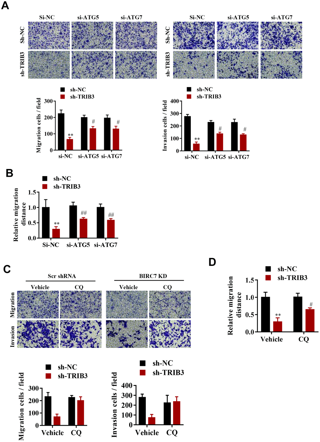 To explore whether TRIB3-mediated suppression of autophagy promotes the proliferation and migration of GBM cells, cell migration and invasion were assessed after ATG5 or ATG7 knockdown. Interestingly, knockdown of both ATG5 and ATG7 significantly reversed the migration and invasion inhibition induced by TRIB3 knockdown (Figure 6A, 6B). As expected, inhibition of autophagy by CQ also significantly attenuated migration and invasion inhibition induced by TRIB3 knockdown in GBM cells (Figure 6C, 6D).