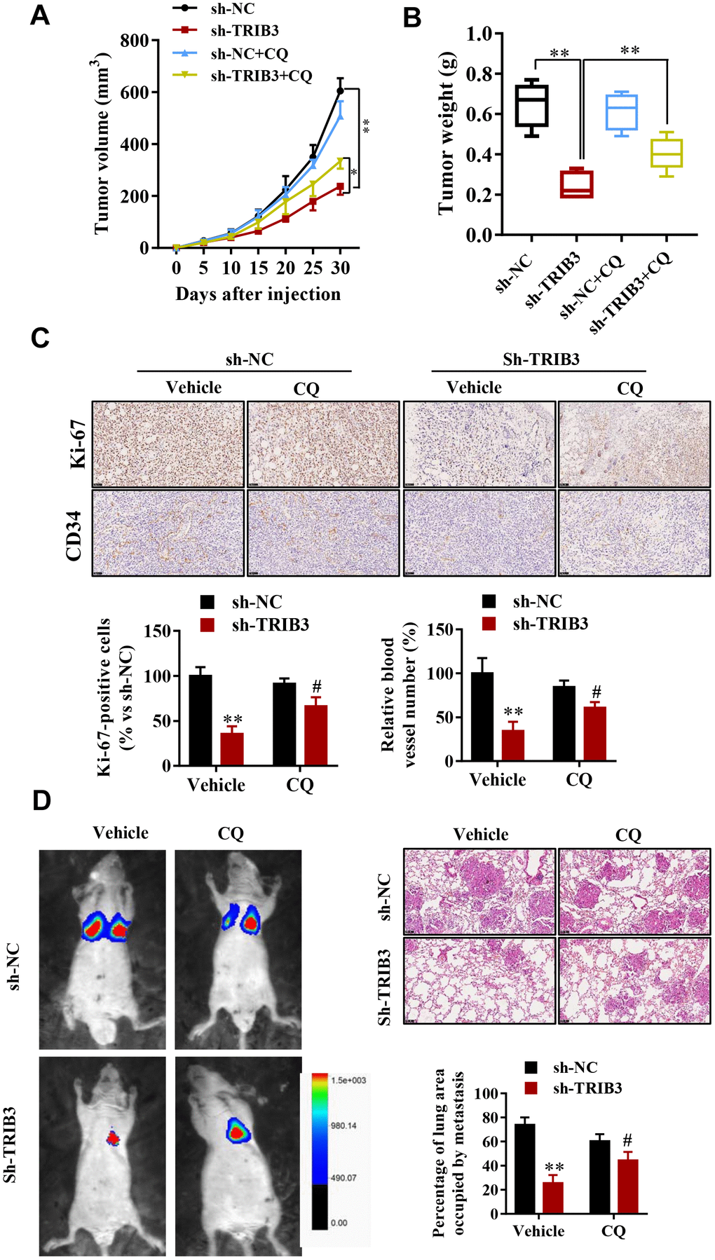 To determine the potential therapeutic efficacy of TRIB3 knockdown, tumor growth in response to treatment was investigated in a xenograft mouse model. U251 cells stably transfected with sh-TRIB3 or empty vector were injected into nude mice treated with CQ or not. After four weeks, we found that sh-TRIB3 significantly reduced the tumor volume and tumor weight of sh-TRIB3 mice compared with those of the control group, while these effects were abolished by CQ treatment (Figure 7A, 7B). In addition, CQ reversed the decreased numbers of Ki-67-positive cells induced by TRIB3 knockdown. In addition, CD34 staining showed that CQ also partially abolished the angiogenesis inhibition induced by TRIB3 knockdown (Figure 7C). Next, we evaluated whether the autophagy inhibitor CQ can inhibit the effects of TRIB3 knockdown on GBM metastasis in vivo. GBM cells infected with Lenti-sh-TRIB3 were injected into the tail vein of BALB/c nude mice with or without CQ, and luciferase signals were measured at day 28 to observe the growth of xenografts of GBM tumors in the lung (Figure 7D). Our results demonstrated that TRIB3 knockdown significantly reduced tumor metastasis in vivo. Significantly, the tumor metastasis effects of TRIB3 knockdown were partially reversed when autophagy was inhibited by CQ. Taken together, these data uncovered that the therapeutic effects of TRIB3 deficiency on GBM cells are dependent on autophagy flux and that TRIB3 deficiency enhances autophagy and impairs the malignant progression of GBM in mice.