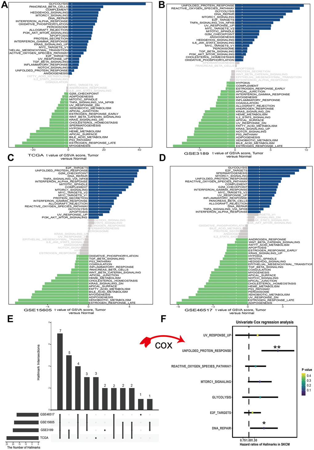 To assess the cancer hallmark pathways enriched in tumor group, we performed gene set variation analysis in four datasets which including GSE3189, GSE15605, GSE46517 and TCGA. According to the cutoff criteria, 25 hallmark pathways differentially activated in TCGA dataset (Figure 1A), 21 hallmark pathways significantly increased in GSE3189 (Figure 1B), 19 hallmark pathways actively expressed in GSE15605 (Figure 1C) and 17 hallmark pathways increasingly expressed in GSE46517 (Figure 1D). The Upset plot showed that there were 7 cancer hallmark pathways commonly enriched in tumor type among four melanoma datasets (Figure 1E). These pathways contained UV response up, unfolded protein response, reactive oxygen species pathway, mTORC1 signal, glycolysis, E2F targets and DNA repair among which only unfolded protein response (p<0.01) and DNA repair (p<0.05) significantly correlated with OS in TCGA dataset (Figure 1F). Finally, unfolded protein response regarded as the most significant pathway in melanoma and selected for further research.