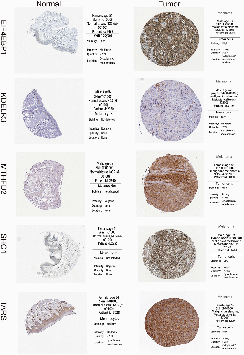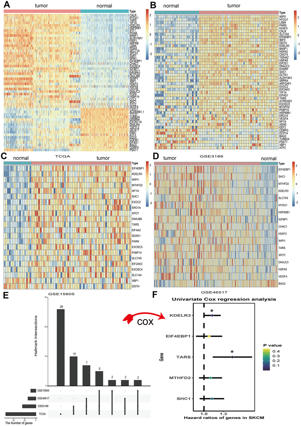 A total of 113 UPRRGs was obtained from the molecular signature database. Based on the differential analysis standard, 54 differentially expressed UPRRGs were selected in TCGA dataset in which 37 genes were up-regulated and 17 genes were down-regulated (Figure 2A). 46 differentially expressed UPRRGs contained 39 up-regulated and 7 down-regulated genes were distinguished in GSE3189 (Figure 2B). 22 differentially expressed UPRRGs were found in GSE15605, which including 22 up-regulated genes and 2 down-regulated genes (Figure 2C). In addition, 16 significantly up-regulated genes and 2 significantly down-regulated genes were identified in GSE46517 (Figure 2D). The overlap of differentially expressed UPRRGs among the four datasets were shown in Figure 2E. Finally, 5 differentially expressed UPRRGs were figure out for subsequent research. These genes contained KDELR3, EIF4EBP1, TARS, MTHFD2, SHC1 which all highly expressed in melanoma compared to normal skin in The Human Protein Atlas (Figure 3).