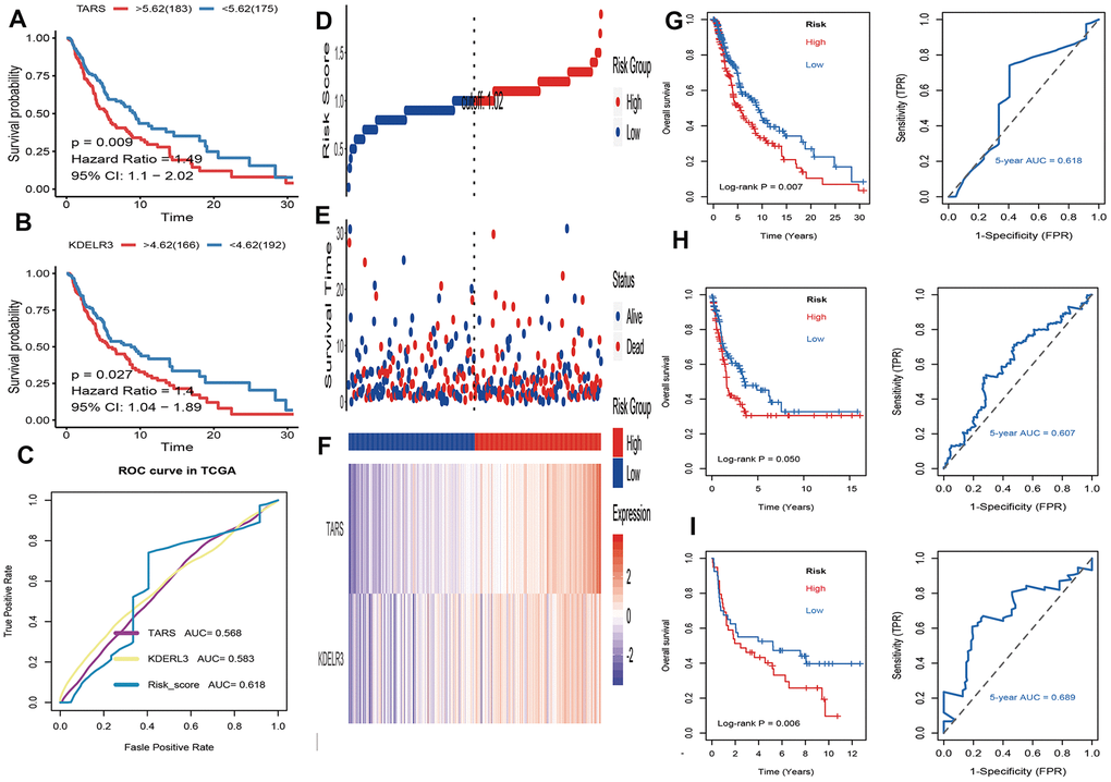 Firstly, univariate cox regression analysis was applied to assess relationships between 5 differentially expressed UPRRGs and OS in TCGA dataset. The results of univariate regression for 5 differentially expressed UPRRGs were listed Table 1. Based on the selection criteria, 2 survival-related UPRRGs were seeded out (Figure 2F). Kaplan-Meier plots of 2 survival-related UPRRGs manifested that high expression of TARS (Figure 4A) and KDELR3 (Figure 4B) was associated poor survival in melanoma. Then, we used multivariate cox regression analysis to calculate coefficients for each gene and construct the risk score system. Compared the area under the curve (AUC) of TARS and KDELR3, the ROC curve for risk score was superior to KDELR3 or TARS alone (Figure 4C). The distributions of the risk scores, OS, vital status, and expression levels of corresponding UPRRGs in TCGA dataset were shown in Figure 4D–4F. Next, by applying this risk model, a risk score for each sample in TCGA dataset will be generated. Then, melanoma samples were classified into a high-risk group (n = 179) and a low-risk group (n = 179) by applying the median cut-off value of the risk scores. Kaplan-Meier curves showed that patients in high-risk group have a shorter survival time than low-risk with a log-rank test of p=0.007. To estimating the prediction power of 2 UPRRGs features, the ROC curve was drawn and 5 years of AUC was 0.618 (Figure 4G). Besides, in order to confirm the robustness of the result, verification test was conducted in GSE65904 and GSE54467 datasets. The GSE65904 and GSE54467 datasets were divided into high-risk and low-risk groups based on TCGA dataset. Kaplan-Meier curves showed that there is a significant difference between high-risk and low-risk group both in GSE65904 dataset (log-rank p=0.05) and GSE54467 dataset (log-rank p=0.006) (Figure 4H, 4I). The 5 years of AUC were 0.607 and 0.689 respectively.