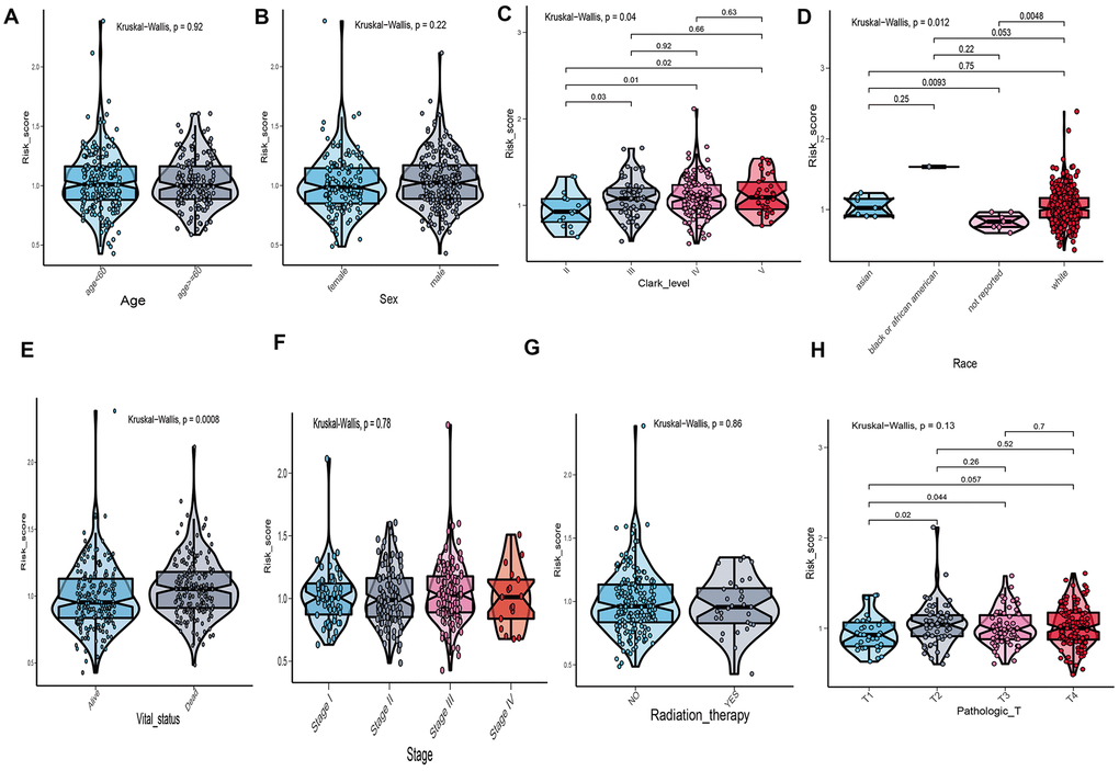 The correlation between risk score of UPRRGs features and clinical variables was explored and the results of boxplot indicated that only Clark level, race and vital status were correlated with risk score (Figure 5C–5E). Other clinical variables, such as age, sex, stage and radiation therapy had no relationships with risk score (Figure 5A, 5B, 5F, 5G). As for tumor size, T2-4 had a higher risk score than T1 (Figure 5H). Hence, the UPRRGs features were associated with three clinical variables and had on effect on other clinical characteristics.