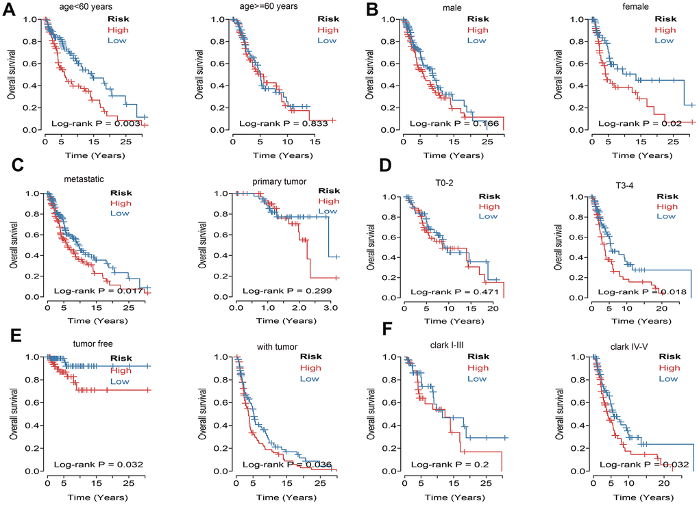 What’s more, to compare the prognostic value of risk score with clinical variables, univariate and multivariate logistic regression were applied. The results revealed that age, race, Clark level, TNM, stage, metastatic status, tumor status and risk sore were significantly associated with OS in univariate analysis, but only age, pathologic M, metastatic status, tumor status and risk score were significantly correlated with OS in multivariate analysis (Figure 6A). Moreover, to explore whether the risk score of UPRRGs is an independent prognostic factor, similar analyses were applied in GSE65904 and GSE54467 datasets, the results suggested that the risk score maintained significant associations with prognosis no matter in univariate multivariate regression (Table 2). The 5 years AUC of age, pathologic M, metastatic status, tumor status and risk score in TCGA were 0.662, 0.521, 0.448, 0.696 and 0.618 respectively (Figure 6B). Furthermore, in order to clarify the prognostic value of UPR features for different clinical subgroups including age, sex, metastatic status, tumor size, tumor status and Clark level were investigated. Kaplan-Meier curves showed that high-risk group in clinical subgroups such as age<60 (p=0.003), female (p=0.02), metastatic tumor (p=0.017), T3-4 (p=0.018), tumor free (p=0.032), with tumor (p=0.036) and Clark IV-V (p=0.032) had significantly shorter OS than low-risk group. However, there is no significant difference between high- and low-risk group in subgroups like age>=60 (p=0.833), male (p=0.166), primary tumor (p=0.299), T0-2 (p=0.471), Clark I-III (p=0.200) (Figure 7).