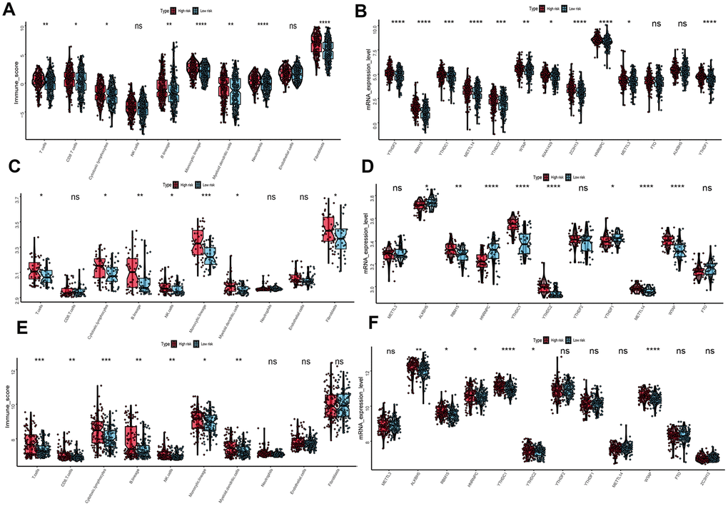 To evaluate the associations between UPRRGs features and immune microenvironment, subgroup analysis of immune cell individuals was performed. The boxplot showed that high-risk group of T cells, CD8 T cells, B cells, cytotoxic lymphocytes, monocytic lineage, myeloid dendritic cells, neutrophils and fibroblasts in TCGA dataset had a higher immune score than those in low risk group (Figure 8A). Similar results also found in GSE54467 (Figure 8C) and GSE65904 (Figure 8E) datasets. Besides, boxplot analysis of m6A RNA methylation regulators in TCGA showed that most of m6A regulators were differentially expressed between high- and low-risk group. The high-risk group had significantly higher expression levels of METTL14, METTL3, WTAP, KIAA1429, ZC3H13, RBM15, YTHDF2, YTHDC1, YTHDC2 and YTHDF1 (Figure 8B). The expression of METTL14, WTAP, KIAA1429, ZC3H13, RBM15, YTHDC1, YTHDC2 and YTHDF1 in GSE54467 was up-regulated in high-risk group compared to low-risk group (Figure 8D). Interestingly, Similar outcomes were found in GSE65904 dataset too (Figure 8F).