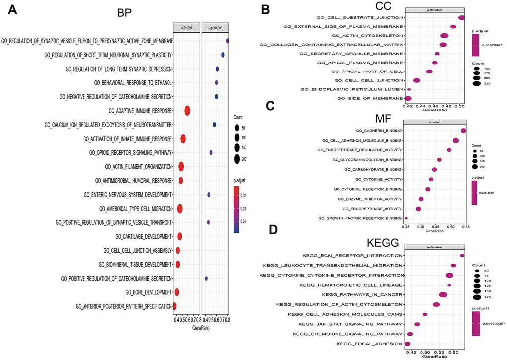 To investigate the significant pathways shared by different high- and low-risk group, we performed GO and KEGG functional pathway enrichment by GSEA analysis. Based on selection standard and ordered pathways by q values. The top ten positive pathways were screen out. The biology process (BP) including adaptive immune response, calcium ion regulated exocytosis of neurotransmitter, activation of innate immune response, opioid receptor signaling pathway and so on (Figure 9A). The cellular component (CC) contained cell substrate junction, external side of plasma membrane, actin cytoskeleton, containing extracellular matrix and so forth (Figure 9B). The molecular function (MF) including cadherin binding, cell adhesion molecule binding, endopeptidase regulator activity, glycosaminoglycan binding (Figure 9C). Additionally, KEGG enrichment showed that ECM receptor interaction, leukocyte transendothelial migration, cytokine-cytokine receptor interaction, hematopoietic cell lineage and so on were positively enriched in high-risk group (Figure 9D).
