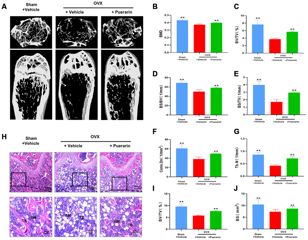 The animal experiments were performed according to the protocols approved by the Institutional Animal Care Committee, Zhangjiagang Traditional Chinese Medicine Hospital (approval number: 2018A011). Briefly, we purchased eleven-week-old C57BL/6J mice (JOINN Laboratories, Suzhou, China) and randomly divided into sham, OVX and OVX+puerarin groups (6 mice per group). We prepared a 10 mM Puerarin (Sigma-Aldrich, Sydney, Australia) stock solution in dimethylsulfoxide (DMSO; Thermo Fisher Scientific, Scoresby, Australia) and diluted puerarin before use in PBS (Thermo Fisher Scientific, Scoresby, Australia). Bilateral ovariectomy was carried out to induce osteoporosis under anesthesia for the mice in OVX and OVX+Puerarin groups, a sham procedure in which the ovaries were only exteriorized but not resected was performed on sham group mice.. After one week of recovery, the mice in the OVX+puerarin group were administered with 100 mg puerarin per Kg body-weight through intraperitoneal injections every two days for six weeks before being sacrificed. The mice in the sham and OVX groups were injected intraperitoneally with 1% DMSO in PBS.