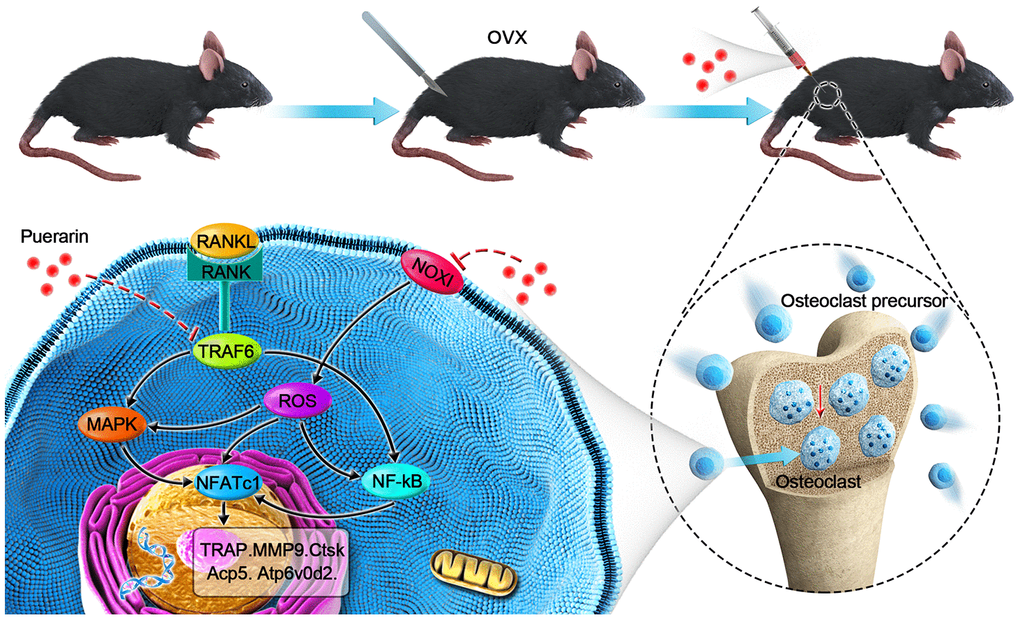 Puerarin is a major isoflavone glycoside extracted from the Chinese herb Pueraria radix. It has shown immense therapeutic potential for reducing blood pressure [17, 18], blood sugar [19, 20], blood lipids [21, 22], and cancer [23–25]. Puerarin decreases bone mass loss (osteopenia) in a concentration dependent manner by stimulating osteoprotegerin (OPG), which promotes osteogenic-specific transcription factors and inhibits Receptor Activator of Nuclear factor-κB (NF-κB) Ligand (RANKL)—a key promoter of osteoclastogenesis [26–28]. Several studies also show that puerarin inhibits osteoclastogenesis and bone resorption. For example, a recent study demonstrated that puerarin inhibits osteoclastogenesis by inhibiting RANKL-dependent and RANKL-independent autophagic responses [29]. However, the mechanism through which puerarin inhibits osteoclastogenesis and osteoporosis are unclear. Therefore, in this study, we investigated the mechanism through which puerarin inhibits osteoclastogenesis and osteoporosis using in vitro cell models and the in vivo ovariectomy (OVX)-induced osteoporosis model mice.