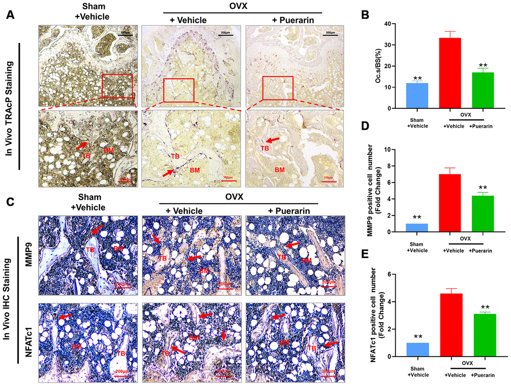 Several studies have implicated excessive activity of the osteoclasts in the pathogenesis related to osteoporosis. Therefore, we measured the effect of puerarin on the osteoclast numbers and function in the in vivo OVX-induced osteoporosis model mice. Tartrate resistant Acid Phosphatase (TRAcP) activity staining of the bone sections demonstrated that the numbers of osteoclasts in the bone tissues of the OVX+ puerarin group mice were significantly lower compared to those in the OVX group mice (Figure 2A). Puerarin treatment significantly reduced the numbers of osteoclasts and the surface area of the osteoclasts on the bone surface compared to the OVX group (Figure 2B). IHC analysis of bone resorption markers MMP9 and NFATc1 showed that the numbers of MMP9- and NFATc1-positive cells were significantly higher in the OVX group compared to the sham group, but were significantly reduced in the OVX+ puerarin group compared to the OVX group (Figure 2C–2E). Moreover, we did not observe any adverse events during the OVX procedure or puerarin treatment. The H&E staining of the liver and kidney tissues in the OVX+puerarin treated mice showed normal morphology (Supplementary Figure 1). Overall, these results demonstrate that puerarin reduces bone loss in the OVX-induced osteoporosis mice by suppressing the proliferation of TRAcP-positive osteoclasts and inhibiting the bone resorption activity of the osteoclasts.