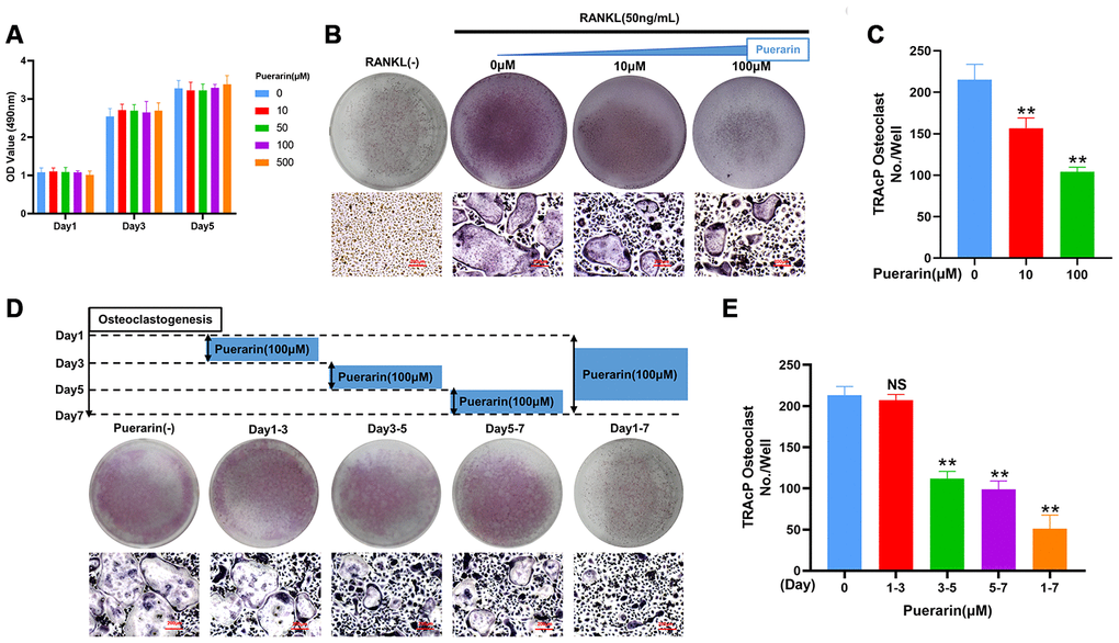 CCK-8 assays demonstrated that treatment with 10 and 100 μM puerarin did not reduce BMM viability (Figure 4A). The in vitro osteoclast differentiation was evaluated by treating BMMs with 50 ng/mL M-CSF and 50 ng/mL RANKL in the presence of 0, 10, and 100 μM puerarin. The results showed that puerarin decreased the formation of multinucleated osteoclasts in a dose-dependent manner compared to the RANKL-induced group (Figure 4B–4C). Furthermore, the number of TRAcP-positive osteoclasts decreased when RANKL-induced BMMs were treated with 100 μM puerarin on days 3-7 but had no effects when treated on days 1-3 (Figure 4D, 4E).