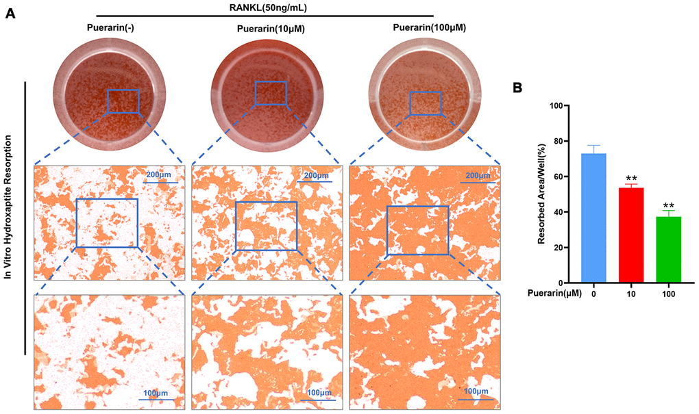 We cultured 1 × 105 BMMs per well in 24-well hydroxyapatite-coated plates (Corning Life Sciences, St. Lowell, MA, USA) and treated with 0, 10, or 100 μM puerarin in α-MEM medium containing with 50 ng/mL RANKL and 50 ng/mL M-CSF for 5 days. Then, the wells were washed with PBS to remove cells, and the areas of hydroxyapatite resorption was observed by a Optical Microscope Olympus CKX53 (Tokyo, Japan) and quantified with the Image J software (NIH, Bethesda, Maryland, USA).
