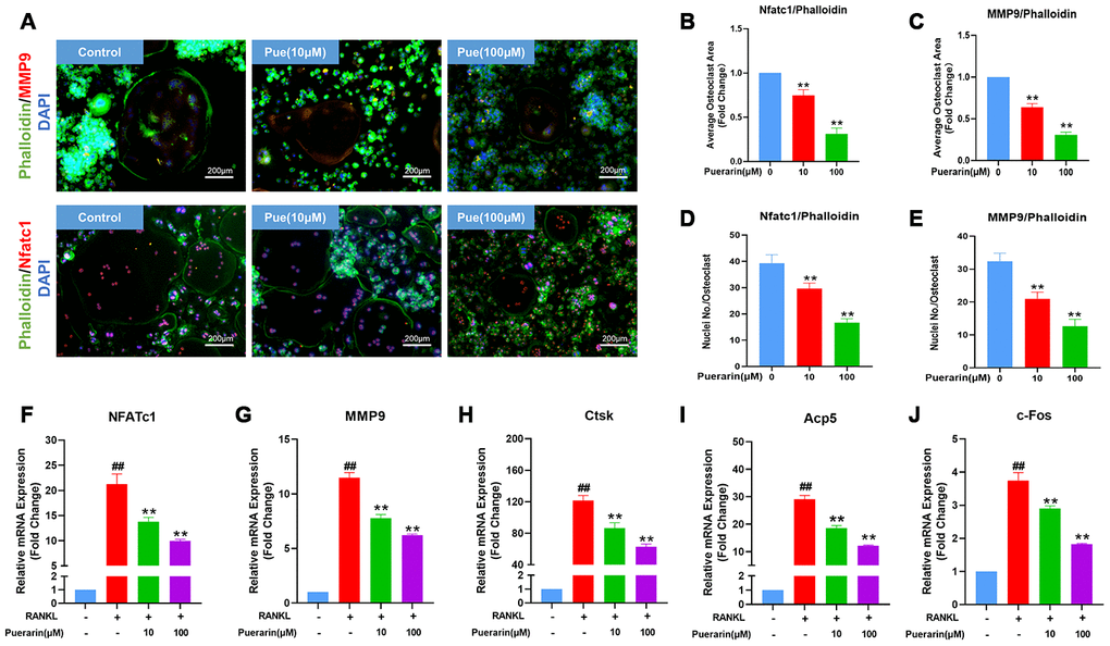 Fresh bone marrow macrophages (BMMs) were isolated from the femur and tibia of the female C57BL/6J mice. Briefly, total bone marrow cells were cultured in α-MEM medium (GE Healthcare, Pittsburgh, USA) containing 10% FBS (Gibco, Rockville, USA) and 50 ng/mL M-CSF for 24 h. Then, the non-adherent BMMs were induced with 50 ng/mL M-CSF (R&D Systems, Minneapolis, MN, USA) and 50 ng/mL RANKL (R&D Systems, Minneapolis, MN, USA). The BMMs were treated with 0, 10 and 100 μM puerarin. The concentration of DMSO in the working solution was less than 0.1%. The culture medium of the BMMs was replaced every two days.