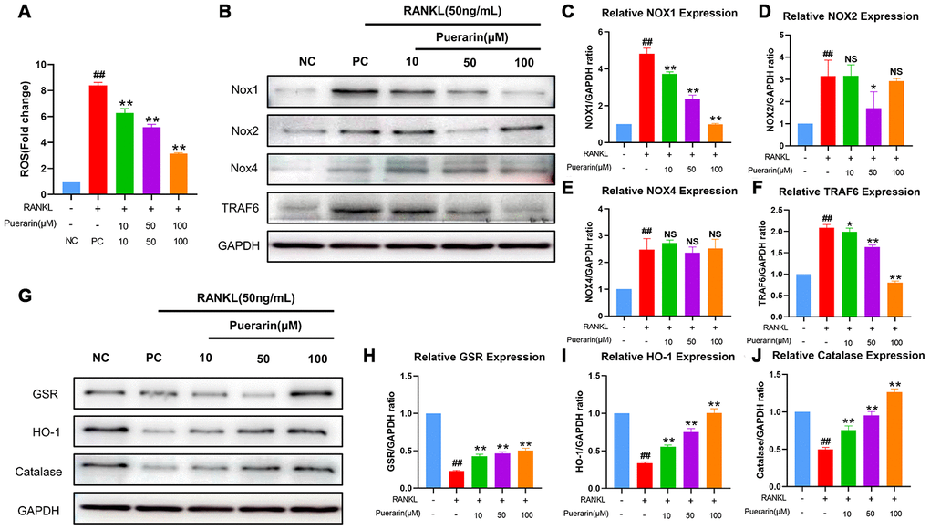The NADPH oxidases (NOXs), namely, NOX1, NOX2 and NOX4, are important contributors of cellular ROS [34]. Moreover, the levels of antioxidant enzymes, glutathione disulfide reductase (GSR), HO-1, and catalase, play a crucial role in downregulating cellular ROS [35, 36]. Therefore, we analyzed the effects of puerarin on the levels of NOX1, GSR, HO-1 and catalase proteins during in vitro osteoclastogenesis. The NOX1 protein levels were significantly upregulated in the RANKL-induced RAW264.7 cells, but were reduced by puerarin in a dose-dependent manner (Figure 7B, 7C). Furthermore, GSR, HO-1 and catalase levels were reduced in the RANKL-induced RAW264.7 cells, but were upregulated by puerarin in a dose dependent manner (Figure 7G–7J).