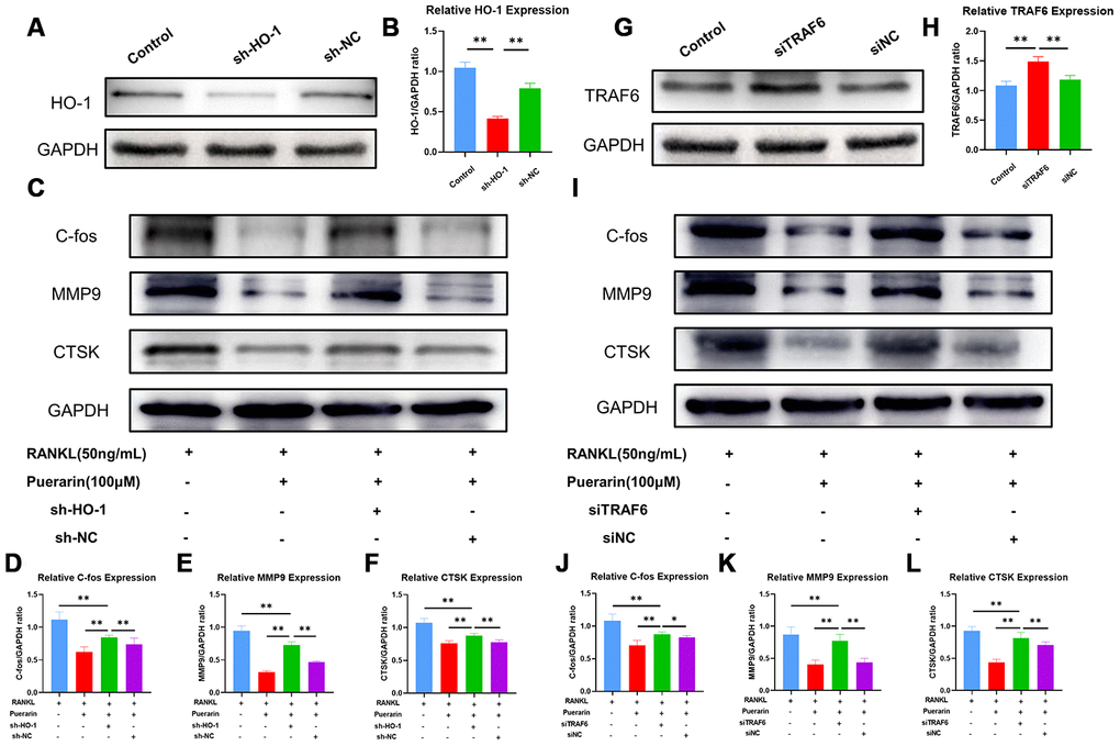 Next, we analyzed the effects of puerarin on ROS signaling by lentiviral knockdown of HO-1 (Figure 8A and 8B) and overexpression of TRAF6 (Figure 8G and 8H) in the RAW264.7 cells. As shown in Supplementary Figure 2A, ROS levels were significantly reduced in the puerarin+RANKL-induced RAW264.7 cells compared to the RANKL-induced RAW264.7 cells, but, the effects of puerarin were abolished by HO-1 knockdown or TRAF6 overexpression. Furthermore, the levels of osteoclast differentiation-related proteins, c-Fos, MMP9 and CTSK were significantly downregulated in the puerarin+RANKL-induced RAW264.7 cells compared to the RANKL-induced RAW264.7 cells, but these effects were partially abrogated by HO-1 knockdown (Figure 8C–8F) and TRAF6 overexpression (Figure 8I, 8L). These results were further confirmed by the TRAcP staining and hydroxyapatite resorption assays (Supplementary Figure 2B–2E). Taken together, these results suggest that puerarin partly suppresses ROS production by inhibiting Nox1 and TRAF6 expression and increasing the levels of antioxidant enzymes such as HO-1.