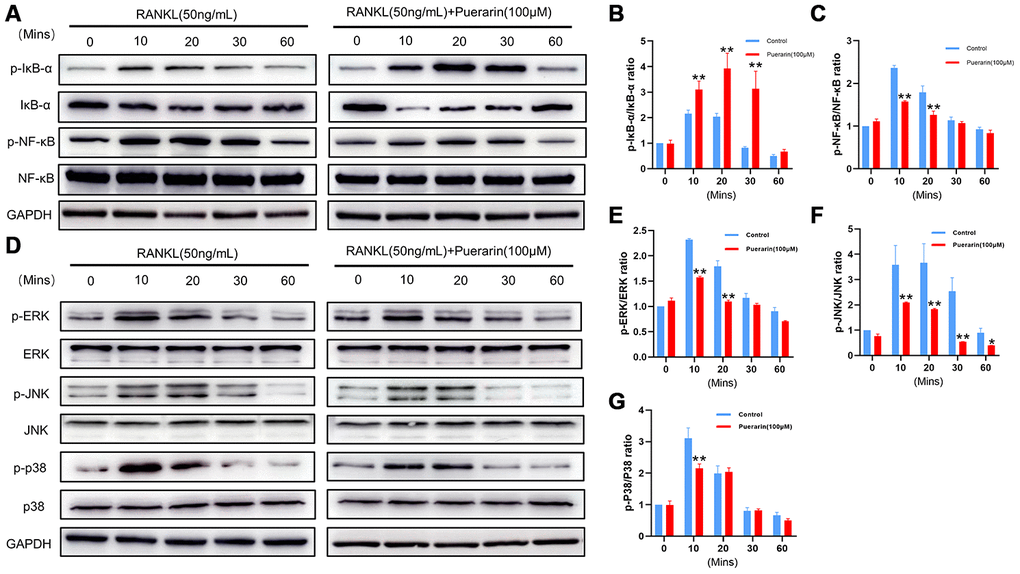 Finally, this study has some limitations. Firstly, we demonstrate that puerarin inhibits osteoclastogenesis, both in vivo and in vitro, but, the osteoblasts also play a significant role in the bone homeostasis. We observe that puerarin promotes in vitro osteoblast differentiation (Supplementary Figure 4) by activating the p38 MAPK and downregulating the NF-κB signaling pathway in a dose-dependent manner (Supplementary Figure 5). However, the effects of puerarin on osteoblastogenesis and osteoporosis need further investigations. Secondly, in this study, we demonstrate the beneficial effects of puerarin in the OVX-induced osteoporosis model mice, but, its effects on other experimental osteoporosis models remains to be investigated. Thirdly, pathogenesis of osteoporosis involves immune dysfunction and systemic inflammation. However, the effects of puerarin are not known regarding these aspects. Hence, future investigations are required to discover the effects of puerarin on inflammation and osteoporosis.