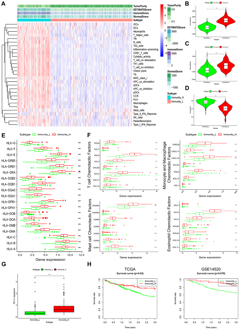 It was seen that most HLA (human leukocyte antigen) genes were upregulated in Immunity_H than in Immunity_L (Figure 1E). Levels of various immunologic chemotactic factors were also markedly elevated in Immunity_H, including T-cell, monocyte, macrophage, mast cell and eosinophil chemotactic factors (Figure 1F) [14]. Evaluation of PD-L1 expression in both HCC subtypes showed that PD-L1 levels were markedly higher in Immunity_H than in Immunity_L (Figure 1G). This implies that the Immunity_H subtype may show a stronger response to anti-PD-L1 immunotherapy given that PD-L1 expression positively associates with immunotherapeutic responsiveness [15].