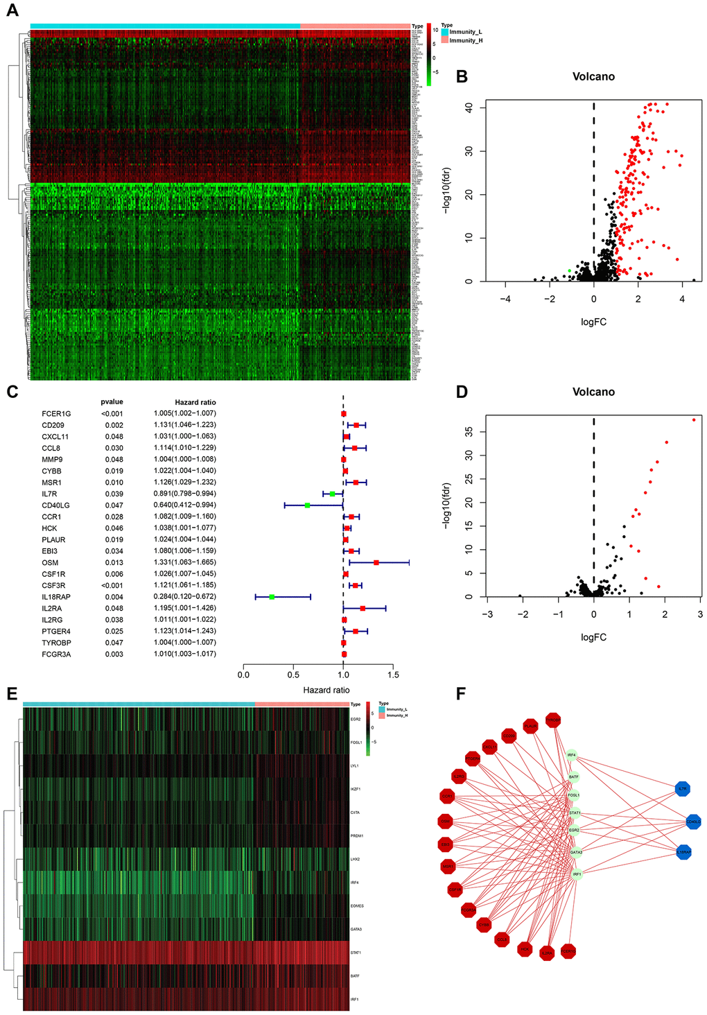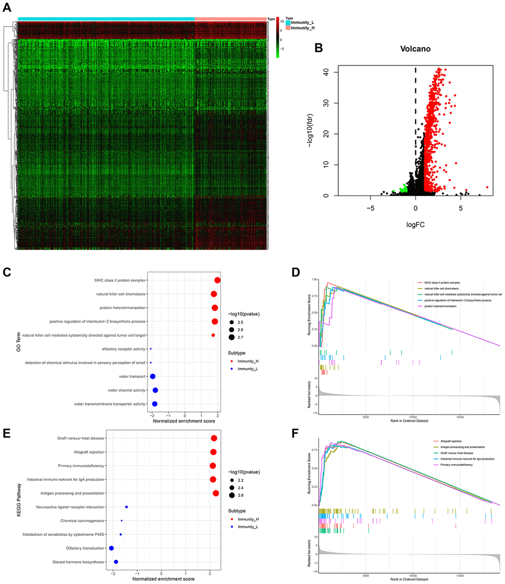 We then used EdgeR to identify HCC subtype-specific gene expression profiles [17]. A total of 729 genes were differentially expressed between Immunity_H and Immunity_L subtypes. Among these, 706 were upregulated and 23 were downregulated (Figure 2A, 2B). GO term analysis revealed that MHC-class II protein complex, natural killer cell chemotaxis and positive regulation of interrleukin-2 biosynthetic process were the most significantly enriched cellular components and biological process in Immunity_H (Figure 2C, 2D). KEGG pathway analysis identified allograft rejection, antigen presentation and processing to be most highly enriched in Immunity_H (Figure 2E, F). These genetic alterations affect the immune system modulations [18–21].