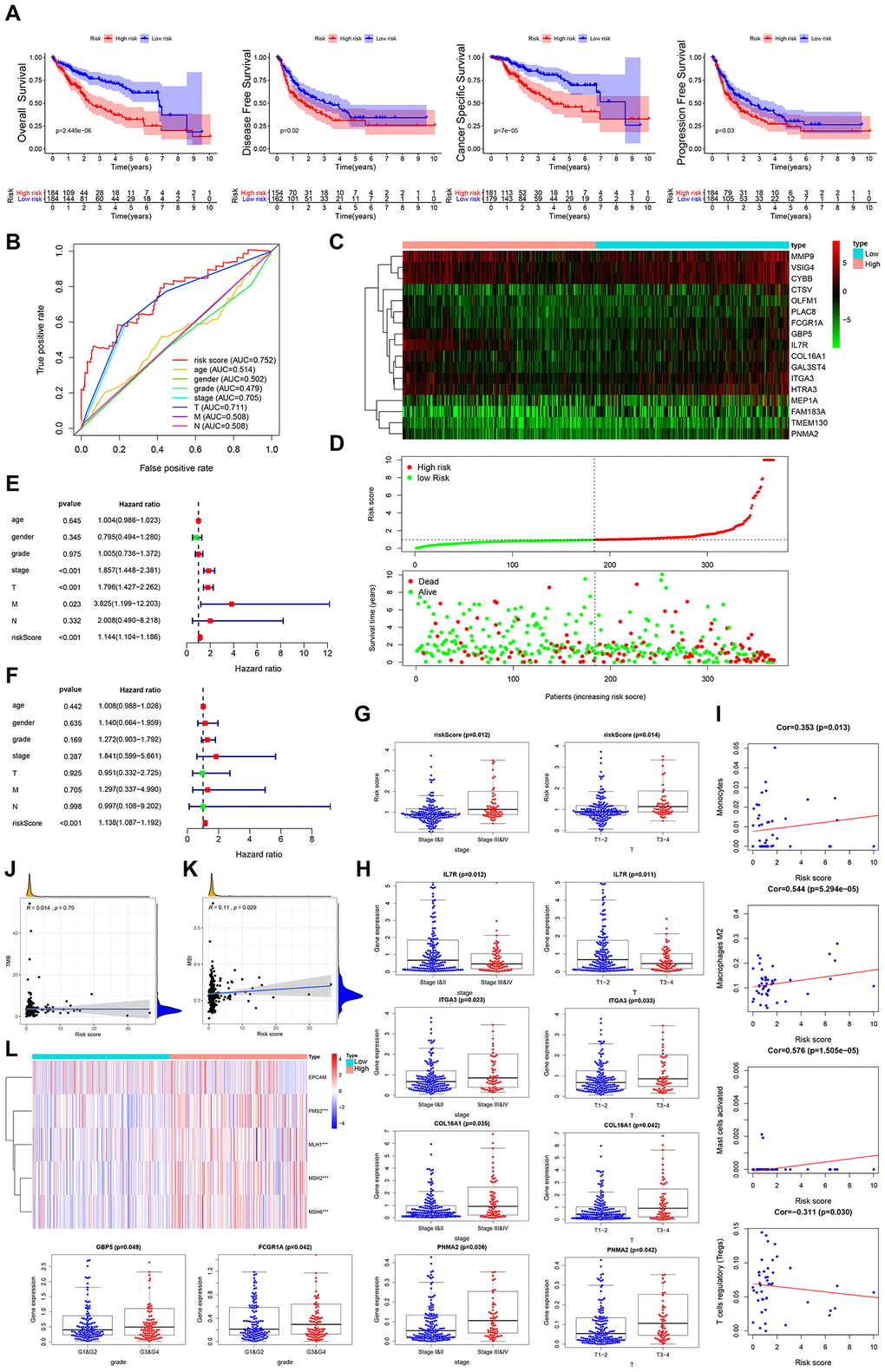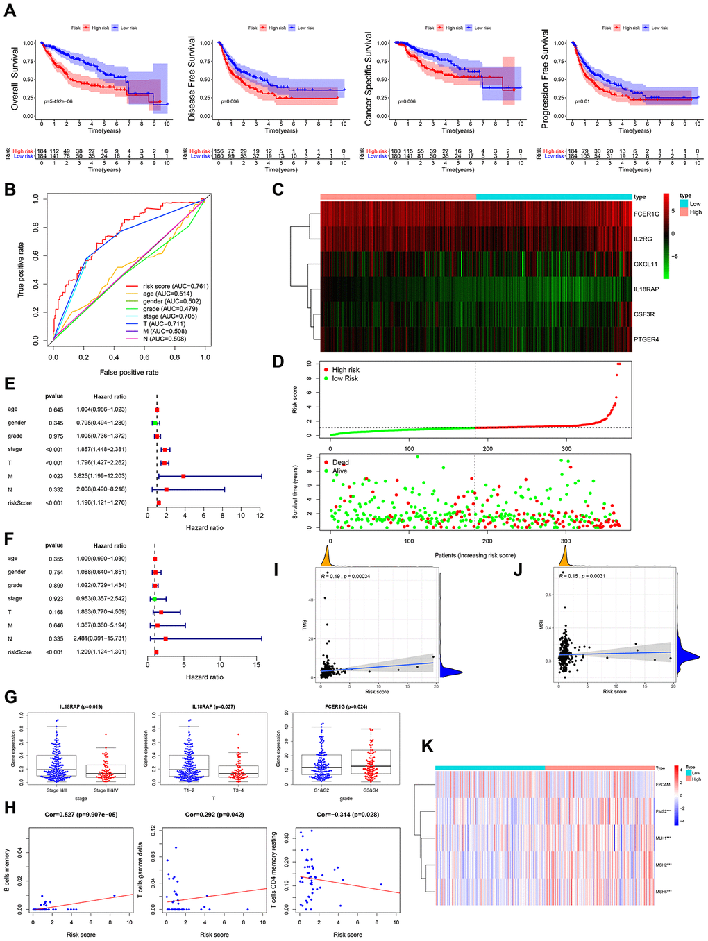 Tumor mutation burden (TMB), impaired DNA mismatch repair (MMR), and microsatellite instability (MSI) have been found to affect response to cancer immunotherapy. Interestingly, we find that the prognostic IRG panel-based risk score correlates positively with TMB and MSI (Figure 4I, 4J). Relative to the low risk group, PMS2, MLH1, MSH2 and MSH6 (the MMR genes) were significantly elevated in the high-risk group (Figure 4K). These results strongly suggest that patients in high risk group may benefit from immunotherapy.