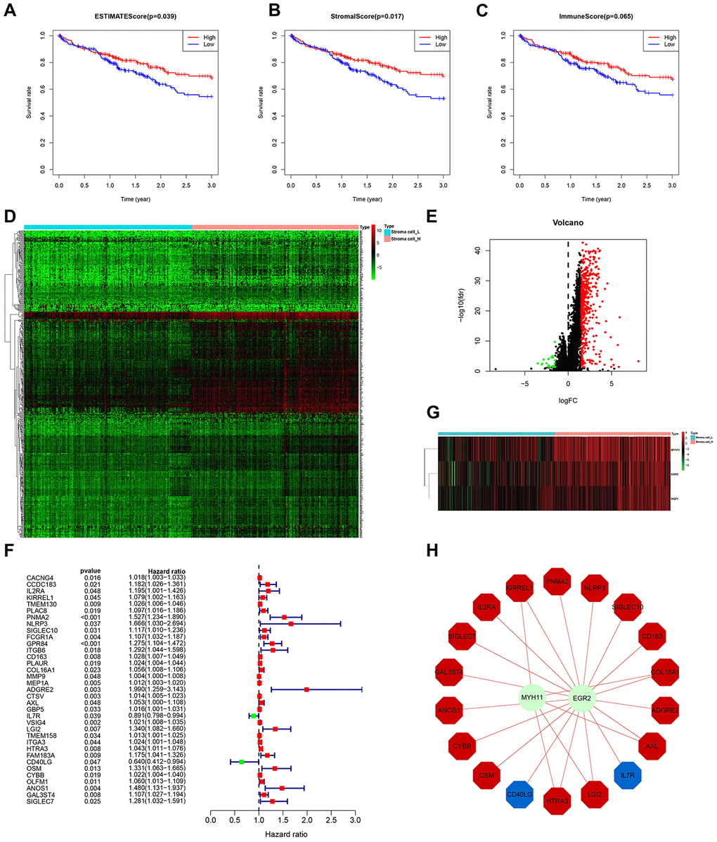 Although ssGSEA-based HCC subtyping showed that Immunity_H contains more stromal and immune cells (Figure 1B, 1C), a more rigorous grouping method based on ESTIMATE scores (stromal score combined with immune score) is necessary to determine disease features related to stromal contents. Thus, we reclassified the 369 HCC samples into high stromal content group (Stroma_H) and low stromal content group (Stroma_L) based on median ESTIMATE score. Expectedly, survival analysis suggested that Stroma_H correlated with significantly better 3-year survival than Stroma_L (Figure 5A). To identify the stromal components responsible for distinct clinical outcomes, we further divided the samples into the high stromal cell content group (Stroma cell_H), low stromal cell content group (Stroma cell_L), high immune cell content group (Immune cell_H) and low immune cell content group (Immune cell_L), based on median value of stromal score and immune score, respectively. Survival analyses indicated that Stroma cell_H significantly correlated with better 3-year survival, while the effect of immune cell content on survival rate did not significantly differ between groups (Figure 5B, 5C).