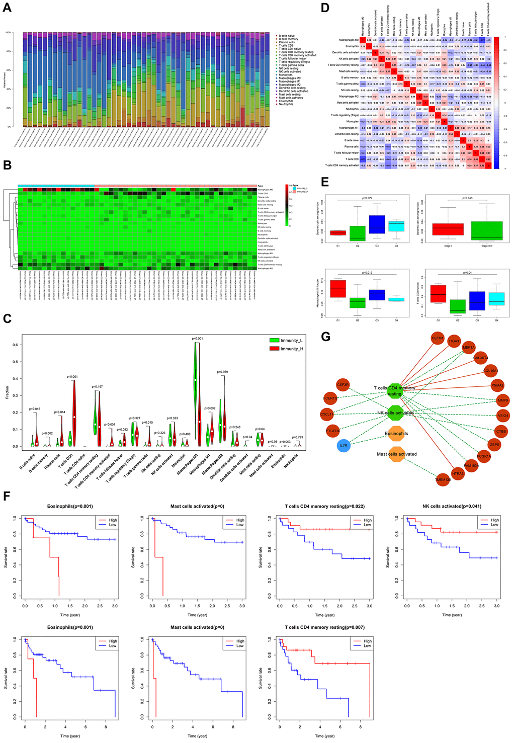 Next, we used CIBERSORT [22], to investigate immune infiltration of 22 subpopulations of immune cells in the above HCC samples. Fifty cases with reliably predicted results were identified using a p-value cutoff of ≤0.05. The proportions of immune cells in HCC vary significantly between samples (Figure 7A). Since we speculated that variation in the proportion of tumor-infiltrating immune cells (TIICs) may represent differences between subtypes, the samples of Immunity_H (34/50 cases) and Immunity_L (16/50cases), were separated into 2 discrete groups for further investigation (Figure 7B). Relative to Immunity_L, naive B-cells, memory B-cells, plasma cells, CD8 T-cells, activated CD4 memory T-cells, follicular helper T-cells, gamma delta T-cells, M0 macrophages, M1 macrophages and activated dendritic cells, presented significant abundance differences in Immunity_H (Figure 7C). The proportions of different TIIC subpopulations exhibited only weakly-moderately correlation with each other (Figure 7D). These results indicate the clinical significance of heterogeneous immune infiltration in HCC.