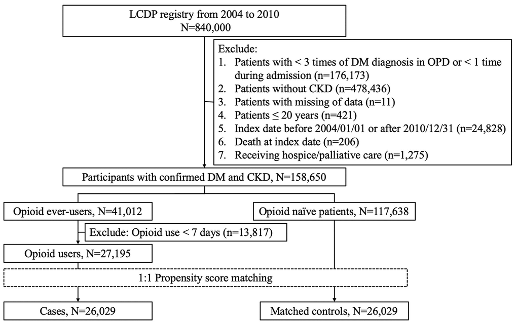 Suitable candidates were identified from the Longitudinal Cohort of Diabetes Patients (LCDP), a purposefully assembled cohort consisting of an annual random nationwide sampling of Taiwanese patients with diabetes, between 2004 and 2010. LCDP is frequently utilized for conducting diabetic research in the existing literature [12, 27, 28], with credible findings. In accordance with our study aim, we first confirmed the diagnosis of DM and CKD by imposing the following restrictions: for DM, participants needed to have ≥3 times of diagnosis in outpatient settings or ≥1 time during admission; for CKD, they needed to have validated diagnoses of CKD ≥3 times in outpatient settings or ≥1 time during admission (codes available elsewhere) [27, 29]. In Taiwan, the diagnosis and coding of CKD is usually based on the presence of an estimated glomerular filtration rate (eGFR) < 60 ml/min/1.73m2. The day when patients satisfied both diagnoses of DM and CKD was defined as the index date, after which patients started follow-up. Those who were younger than 20 years, with missing data, and those with an inadequate follow-up period (< 1 year; or index date after December 31st, 2010) were also excluded. Because opioids are frequently used to achieve satisfactory pain control in those receiving hospice/palliative care [30], and to avoid confounding by indications, we also excluded those who had any reimbursement codes of hospice/palliative care throughout the study period (Figure 1).