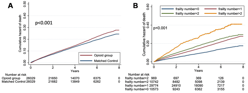 Continuous and categorical variables are described as means ± standard deviations and numbers with percentages in parentheses, respectively, followed by comparisons between groups using Student’s t-test and chi-square test, respectively. We first compared demographic profile, lifestyle factors, comorbidities, CCI, diabetic severity, medication usage, and treatment variables between opioid users and propensity score-matched opioid-naïve patients. We also examined the distribution of FRAIL items between users and naïve ones. After follow-up, we examined the influence of opioid use on long-term mortality using Kaplan-Meier survival analysis and Cox proportional hazard regression modeling, incorporating demographic profiles, lifestyle factors, comorbidities, medication use, FRAIL item counts, and treatment variables. The relationship between FRAIL item counts, or frail severity, and the risk of mortality was also examined using Cox proportional hazard regression analyses. Comparisons of survival curves were performed using the log-rank test among the entire cohort and also among groups with and without 1, 2, and >2 FRAIL items. We additionally tested the dose and duration-dependent relationship between opioid exposure and mortality to validate our findings.