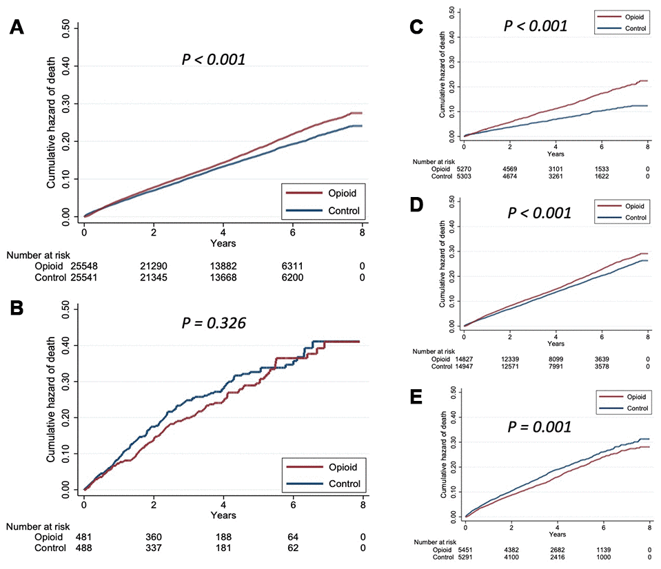 The association between opioid use and mortality in patients with CKD is rarely addressed, and for those who focus on this topic, the study design is usually suboptimal and of low quality. A recent systematic review emphasized the lack of sufficient evidence to support or refute opioid use in patients with CKD, and available studies contained low sample sizes and addressed side effects but not mortality with prominent variations in opioid types and the route of administration [10]. Oh et al. reported that chronic opioid use was not associated with a higher risk of mortality among those with CKD from 2990 critically ill patients [22]. Another Korean study reported that the association between chronic opioid use and mortality in the general population differed depending on opioid potency; those with a strong potency predominantly contributed to the observed mortality risk [23]. However, existing studies rarely focus on the CKD population, and the extrapolation of findings from critically ill, surgical, or general populations to those with CKD can be inaccurate. Our findings are expected to fill this knowledge gap by showing that opioid use increased mortality in patients with CKD, independent of multiple confounders (Table 3).