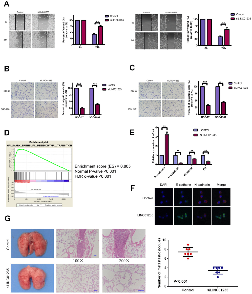 EMT is an essential process in metastasis, which affects GC occurrence and development. We chose HGC-27 and SGC-7901 cell lines for further study. Wound-healing assays showed that silencing LINC01235 markedly reduced GC cell mobility (Figure 2A). Transwell migration and invasion assays also showed that silencing LINC01235 inhibited GC cell migration (Figure 2B, 2C). Gene set enrichment analysis (GSEA) with data from TGGA STAD showed LINC01235 expression was positively related to EMT characteristics (Figure 2D).