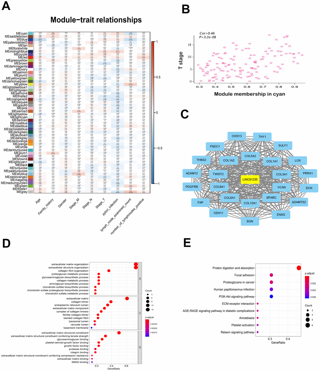 To identify potential LINC01235-associated genes, we used WGCNA to analyze gene expression in 375 patients with GC, and selected gene modules that were highly related to the patients’ clinical information to construct the network (Figure 3A). Eventually, LINC01235 was found to be highly related to T stage, in the cyan module (Figure 3B). We used Cytoscape 3.6.0 software to visualize network relationships in the cyan module (Figure 3C). GO analysis of the genes associated with LINC01235 showed that they were mainly involved in the composition of extracellular matrix (Figure 3D). KEGG analysis showed pathway enrichment in focal adhesion and ECM-receptor interaction (Figure 3E).