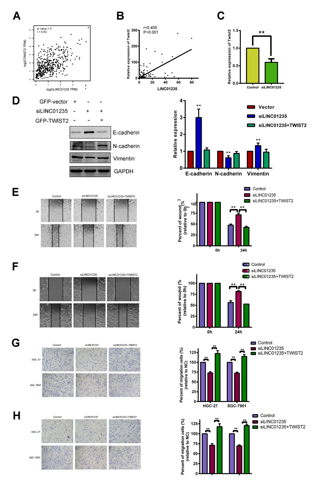 Correlation analysis of TCGA showed that LINC01235 was positively correlated with expression of TWIST2 (Figure 4A). We then tested the 48 pairs of GC and noncancerous tissues, which showed similar results (Figure 4B). We used RT-qPCR to investigate the correlation between LINC01235 and TWIST2 expression in GC cells with knockdown of the LINC01235 gene; they showed significantly down-regulated TWIST2 expression (Figure 4C and Supplementary Figure 1). We next checked the effect of LINC01235 and TWIST2 on expression of EMT-related proteins. Western blotting showed that silencing LINC01235 sharply increased expression of E-cadherin and decreased the expression of vimentin and N-cadherin. However, overexpressing TWIST2 reversed mesenchymal gene suppression and downregulated expression of epithelial genes (Figure 4D). In the wound and transwell recovery assays, it was further confirmed that TWIST2 could reverse the migration and invasion ability of cells by silencing LINC01235 (Figure 4E–4H).