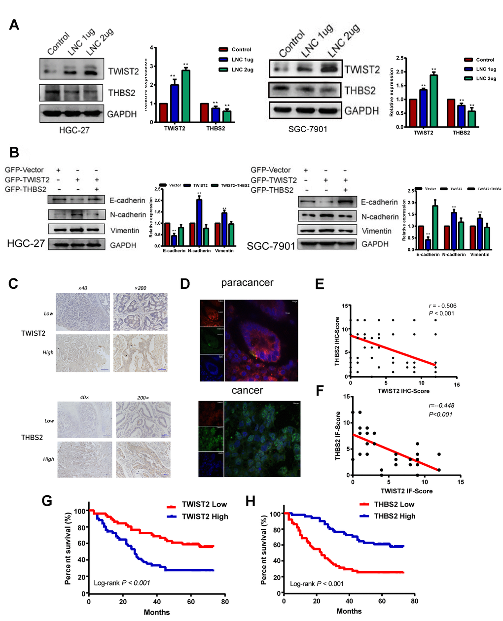 We next investigated TWIST2 and THBS2 expression in GC tissues from 102 patients by IHC. This analysis showed that TWIST2 and THBS2 positive expression rates were 52.0% (53/102) and 44.1% (45/102; Figure 5C). TWIST2 expression was negatively correlated with THBS2 expression (r = -0.506, P < 0.001; Figure 5E). Survival analysis associated high TWIST2 expression with worse prognosis, which was the opposite of THBS2 expression (Figure 5G, 5H). In immunofluorescence assays, we found that the intensity of green fluorescence (TWIST2) in cancer tissue was significantly higher than that of red fluorescence (THBS2), while in the adjacent tissues, we observed the opposite pattern (Figure 5D), and the difference of correlation analysis was statistically significant (r = -0.448, P < 0.001;Figure 5F).