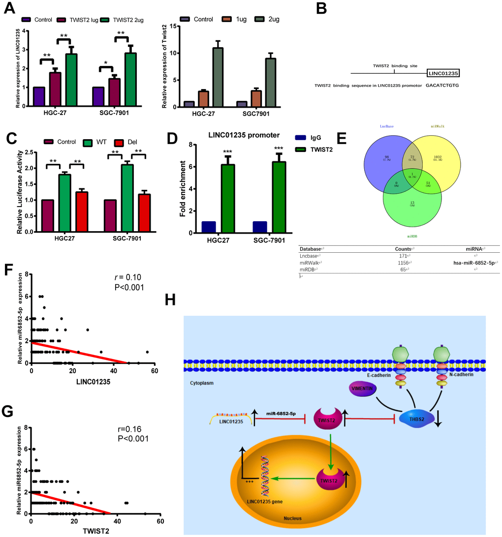 Interestingly, the overexpression gradient of TWIST2 in HGC-27 and SGC-7901 cells showed that LINC01235 expression also increased (Figure 6A). We investigated the predicted binding site for TWIST2 in genomic LINC01235 at the Jaspar website (Figure 6B and Supplementary Table 2), and used luciferase testing to verify that ectopic TWIST2 expression enhanced transcription of firefly luciferase from the wild-type LINC01235 promoter. When the TWIST2-binding sequence was deleted, the firefly luciferase expression significantly decreased (P<0.01) (Figure 6C). We also performed ChIP assays to determine if TWIST2 bound to the LINC01235 promoter in cells. As expected, RT-qPCR results showed that the TWIST2 groups were higher than the IgG control groups (P<0.001; Figure 6D). In order to explore the regulatory effect of LINC01235 on TWIST2, we predicted and analyzed target genes in three databases, LncBase, miRWalk and miRDB. The Venn diagram shows that miR-6852-5p may be the key target miRNA involved in the regulation of TWIST2 by LINC01235 (Figure 6E). The TCGA database analysis showed that the expression of miR6852-5p was negatively correlated with LINC01235 and TWIST2, which further confirmed our idea (Figure 6F, 6G).
