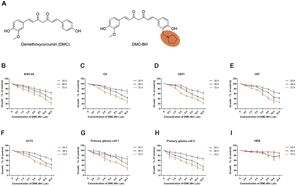 DMC is characterized by high activity, low toxicity, and relative safety. However, both DMC and curcumin have the disadvantages of poor stability and low bioavailability. In a preliminary experiment, we found that DMC does not effectively pass through the blood-brain barrier (BBB) or exert anti-glioma effects in an orthotopic glioblastoma xenograft model. Therefore, the synthesis of structural DMC derivatives with improved biological activity has become the main direction of our research. Among them, a compound named DMC-BH (Figure 1A) exhibited high chemical stability and significant anti-cancer activity. Thus, we investigated the anti-cancer properties of DMC-BH in glioma cell lines and various mouse models. Studies were also performed to examine the ability of DMC-BH to cross the BBB and to inhibit in vivo tumor progression in an orthotopic glioblastoma xenograft model and PDTX model. Using bioluminescent imaging (BLI), we found that the inhibitory effect of DMC-BH on orthotopic glioblastomas is significantly higher than that of DMC, which was confirmed by immunohistochemical studies. In addition, DMC-BH crossed the intact BBB and showed more potent anti-tumor activity than TMZ in a xenograft mouse model using patient-derived glioma-initiating cells.