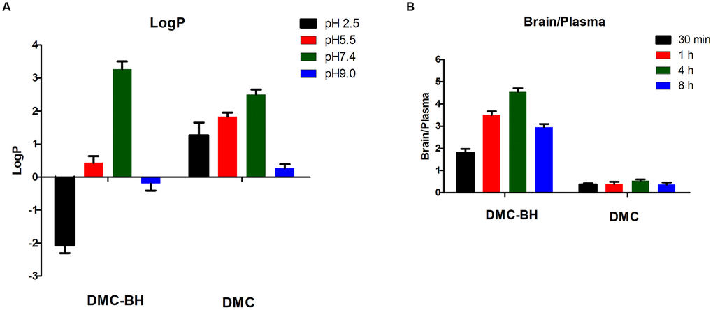 To determine whether DMC-BH inhibits the growth of glioma in the brain, we assessed its octanol-water partition coefficients and BBB penetrability. The hydrophobic parameters (logP) of DMC-BH and DMC were estimated under physiological as well as in acidic and basic conditions. The logP values for DMC-BH were negative at pH 2.5 and pH 9.0, as it was an amphoteric compound. At low pH or high pH conditions, DMC-BH occurred in the form of salts, and its logP values became negative due to better solubility. Under physiological conditions (pH 7.4), the logP value of DMC-BH was 3.26, which was appropriate for BBB penetration (Figure 2A). The distribution of DMC-BH to the brain was extensive, as demonstrated by a brain-to-plasma AUC(4h) ratio of 4.6, while the brain-to-plasma AUC(4h) ratio of DMC was only 0.56 (Figure 2B).