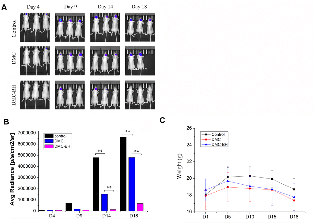 Thirty-six male nude mice weighing between approximately 18 g and 20 g and aged 6 to 8 weeks were divided into a control group, DMC group and DMC-BH group. The nude mice were handled under a laminar flow hood, and the feed, bedding, cage and contact instruments were all used after high pressure disinfection. The amplified U87-Luc cells were passaged in a 6 cm culture dish and placed in a 5% CO2 incubator. Ten percent chloral hydrate (40 μL/10 g) was used to anesthetize nude mice, and the nude mice were fixed on a stereotaxic apparatus when they were under deep anesthesia. We began to digest the U87-Luc cells once the mice were immobilized. The concentration of cells was 1 × 108/mL. Using a micro syringe, we slowly drew up 5 μL cells. Then 5 × 105 U87-Luc cells were injected into the caudate nucleus of the nude mice through an infusion of 1 μL/min. The orthotopic glioblastoma growth was quantified by BLI using an IVIS SPECTRUM 200 system (Perkin Elmer). Either DMC-BH or DMC was administered via intraperitoneal injection at a dose level of 20 mg/kg per injection. The drug administration started 10 days after intracranial implantation of U87-Luc cells, and in vivo imaging confirmed that the tumors were formed. The drug was administered continuously for 18 days. Control mice received an equivalent volume of physiologic solution each day. At day 18, all animals were sacrificed by CO2 inhalation.