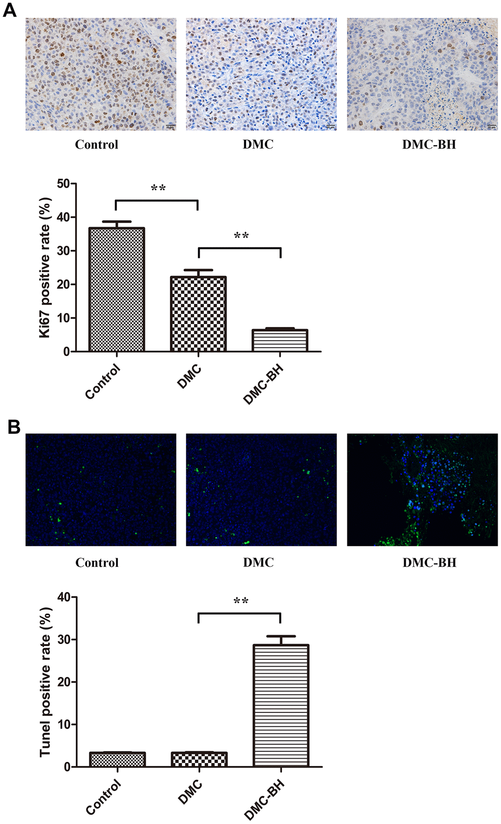 Tissue samples from the xenograft animals were collected for IHC analysis. The antigen Ki67 was used to evaluate cell proliferation ability. The Ki67-positive rates were 6.38% ± 1.38% in the DMC-BH-treated group and 22.17% ± 5.10% in DMC-treated group (P < 0.05) (Figure 5A). The DMC-BH group rate was significantly lower than that of the DMC group (P < 0.05). The Ki67-positive rate of in the untreated group was 36.73% ± 4.82%, which was higher than that in DMC-BH or DMC-treated groups. The percentage of TUNEL-positive cells increased in the DMC-BH-treated group (28.68% ± 5.15%) but not in the control (3.30% ± 0.26%) or DMC (3.33% ± 0.31%) groups (P < 0.05) (Figure 5B).