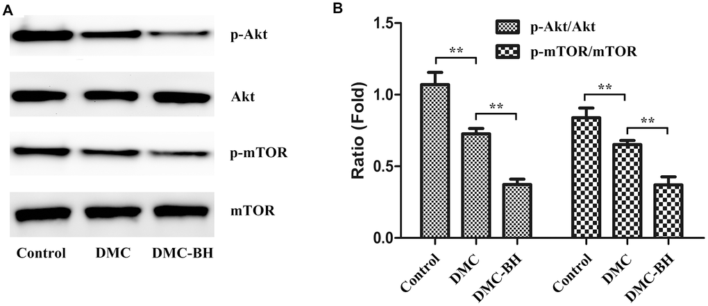 The PI3K/Akt/mTOR signaling pathway is over activated in glioma tissues, and this increased activation is closely related to malignancy and chemoresistance of gliomas [12, 13]. Previous research reported that among its potential anti-tumor actions in breast cancer, DMC targeted multiple AMPK downstream pathways involving dephosphorylation of Akt and mTOR inhibition [14]. Because DMC-BH is a DMC derivative, we further investigated the inhibitory effects of DMC-BH on gliomas by targeting the Akt/mTOR signaling pathway. We evaluated the expression of p-Akt, and p-mTOR in tumor tissues after DMC-BH treatment (Figure 6A). As shown in Figure 6B, p-Akt and p-mTOR levels were significantly higher after DMC-BH treatment compared with DMC or control treatment (P < 0.05). No significant changes were found in total Akt and mTOR expression. Moreover, the expression of p-Akt and p-mTOR in the DMC group was decreased with that in the control group (P < 0.05).