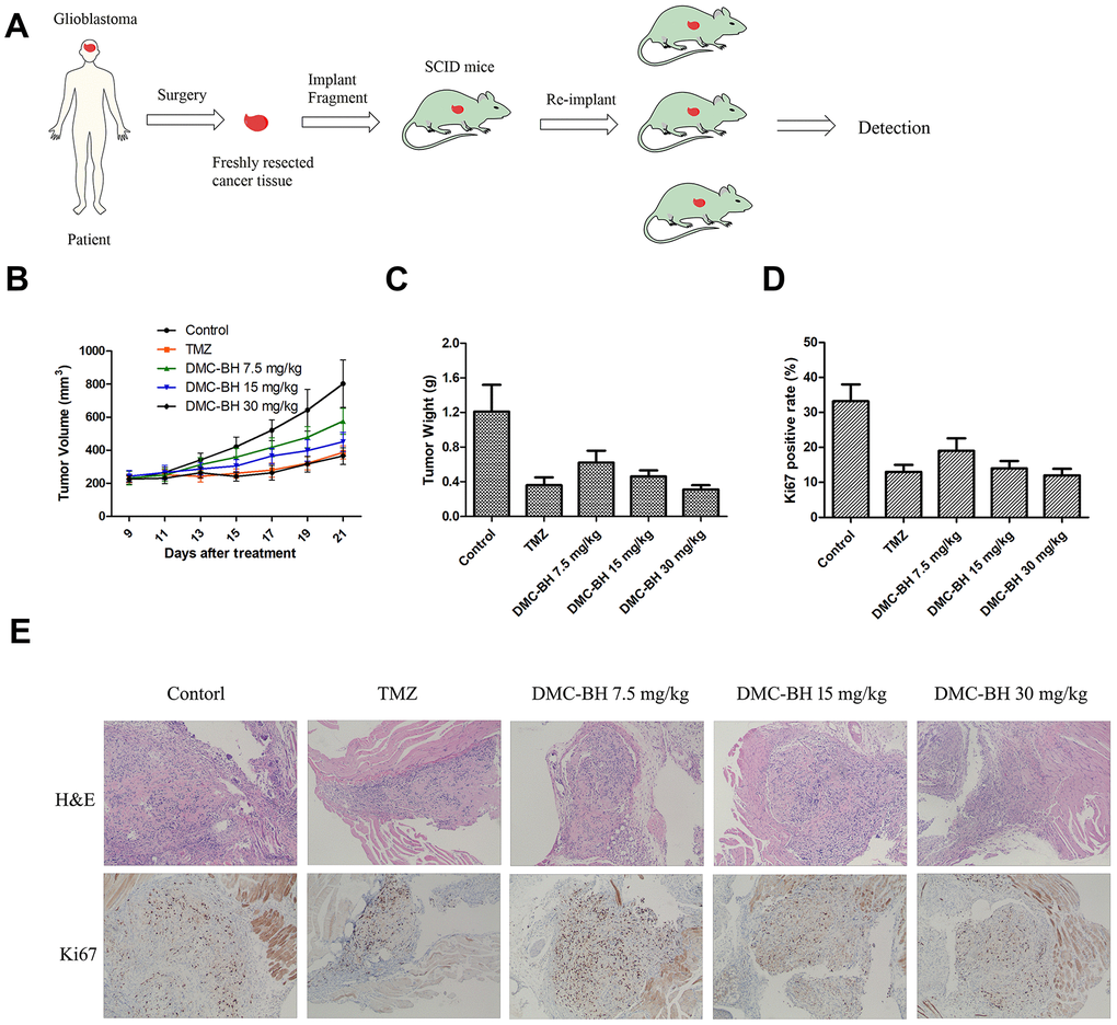 In recent years, PDTX models have been used to mimic human tumors. These models are more clinically relevant than cell line-based xenograft models. Thus, we performed an in vivo study in a PDTX tumor model by implanting human glioma samples from a patient donor into B-NDG mice (Figure 7A). Treatment of DMC-BH or TMZ was tolerated and caused significant tumor regression in immunocompromised mice bearing glioblastoma multiforme (GBM) patient derived tumors (Figure 7B, 7C). To further demonstrate that DMC-BH can efficiently inhibit the growth of glioblastomas, an ex vivo immunofluorescence staining assay was performed (Figure 7D, 7E). A marked decrease in the number of Ki67-positive cells was observed in the tumor treated with 20 mg/kg DMC-BH compared with the control tumor, suggesting inhibition of tumor cell proliferation likely contributed to the anti-tumor effect of DMC-BH.