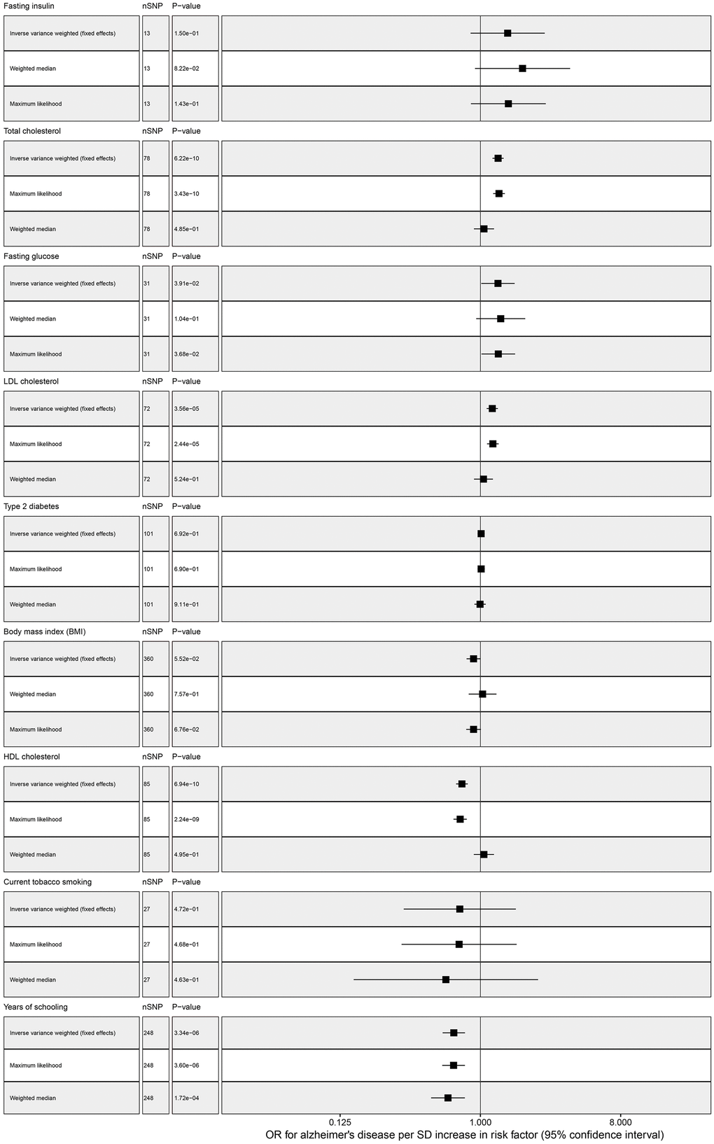 Our results are consistent with both previous traditional observational studies and two sample MR results which provide established evidence that educational attainment was associated with a reduced risk of AD [21–23]. Concentrations of genetically determined total cholesterol and LDL cholesterol showed positive associations with risks of AD, which is consistent with the known causal effect of them on AD risk from previous two sample MR study [24], and similar to our results, elevated HDL cholesterol level also showed causal association with decreased AD risk [24]. The suggestive association between FG and higher AD risk is also consistent with previous study that FG showed suggestive association with AD risk in sensitivity analysis [24]. No observed causal associations between fasting insulin, BMI and AD risk are also consistent with previous two sample MR result [24].