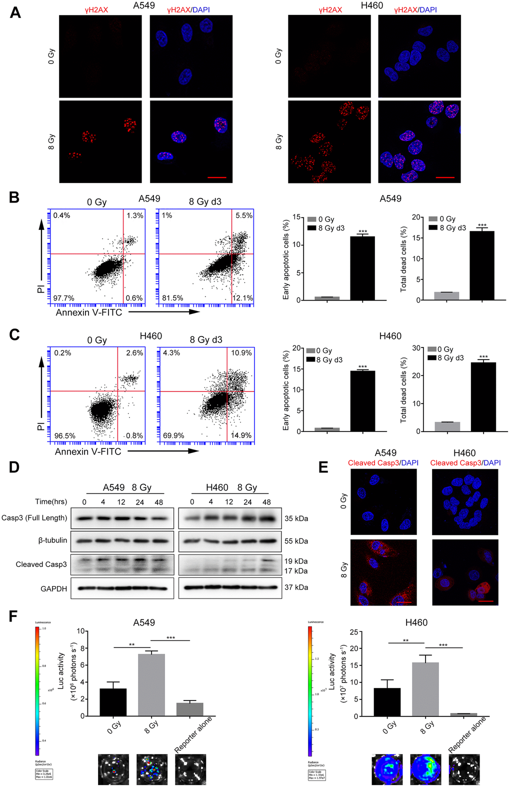 We first performed a colony formation assay to find the optimal X-ray dose that induced tumor cell death. As shown in Supplementary Figure 1, the surviving fractions of A549 and H460 cells irradiated with 8 Gy X-ray were 0.043% ± 0.014% and 0.355% ± 0.018%, respectively. Thus, we selected 8 Gy dose to generate dying NSCLC cells. Phosphorylated histone H2AX (γH2AX) is a well-characterized marker of DSBs [19]. As shown in Figure 1A, compared with the control cells, the levels of γH2AX foci greatly increased in the 8 Gy-irradiated cells at 48 h after irradiation. Cell death was measured using Annexin V-fluorescein isothiocyanate (FITC) and propidium iodide (PI) double staining by flow cytometry. Compared with the control group, the percentage of early apoptotic cells (Annexin V-FITC positive and PI negative) and total dead cells (Annexin V-FITC positive) increased in both the 8 Gy-irradiated A549 and H460 groups on day 3 (Figure 1B, 1C). Because caspase-3 functions in the execution phase of apoptosis, we next used western blotting to determine whether it was activated following irradiation. We observed that 8 Gy irradiation generated cleaved caspase-3 (CC3) in a time-dependent manner in both A549 and H460 cells (Figure 1D). Moreover, immunofluorescence analysis revealed markedly enhanced expression of CC3 after 8 Gy irradiation (Figure 1E). These results demonstrate that 8 Gy irradiation induced DNA damage accompanied by cell death in NSCLC cells.